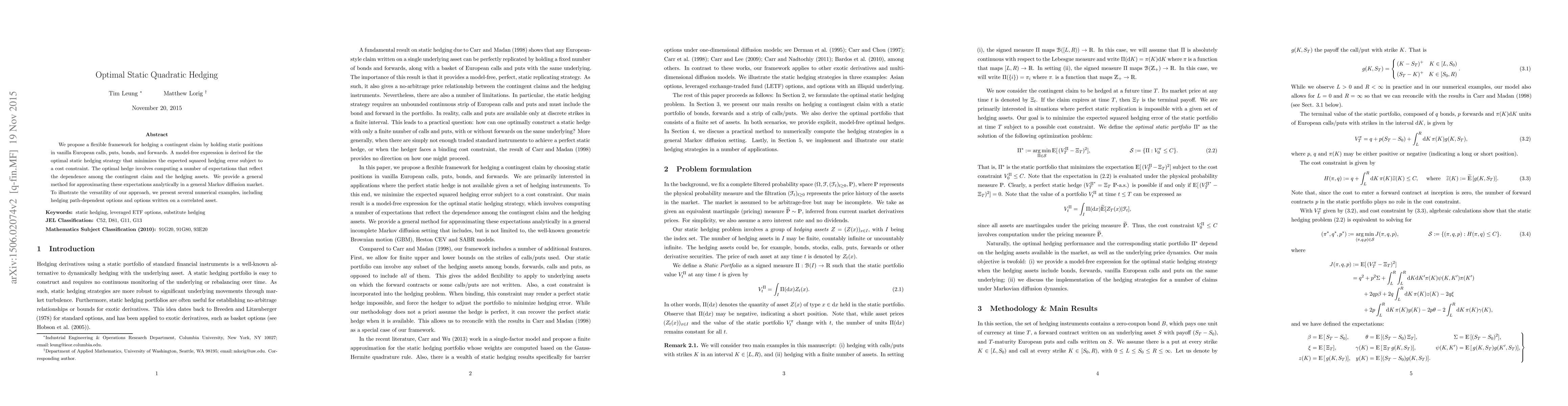 This paper presents a framework for static quadratic hedging using vanilla European options, bonds, and forwards. It derives a model-free expression for the optimal strategy minimizing squared hedging error under cost constraints, providing an analytical approximation method for complex market dependencies. Numerical examples demonstrate its application to path-dependent options and correlated assets.