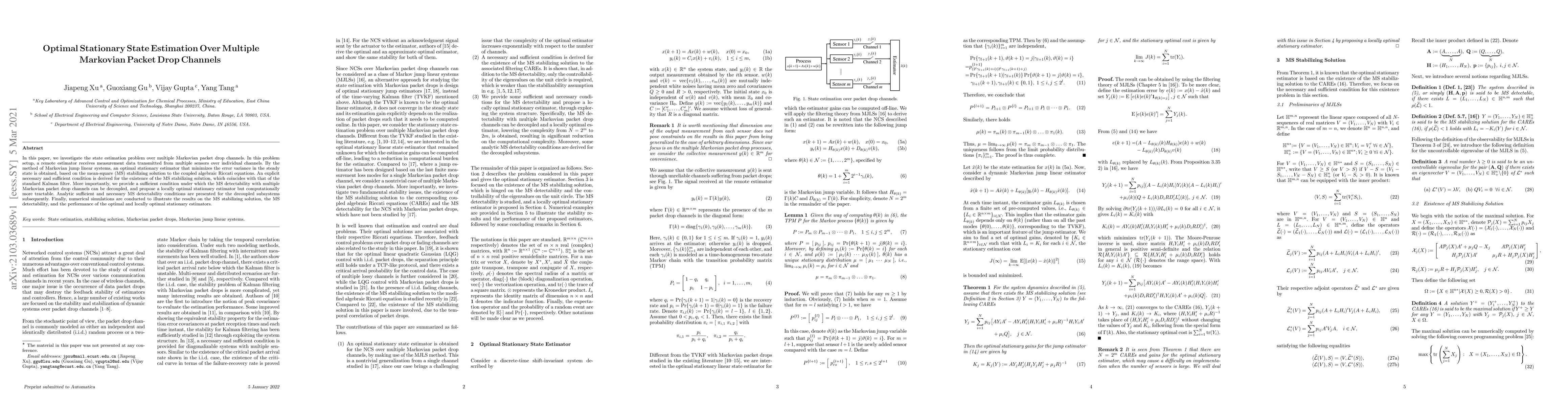 This paper develops an optimal stationary estimator for state estimation over multiple Markovian packet drop channels, deriving necessary and sufficient conditions for mean-square stabilizing solutions. It also proposes a computationally more tractable locally optimal estimator and provides analytic conditions for its decoupled MS detectability, validated through numerical simulations.
