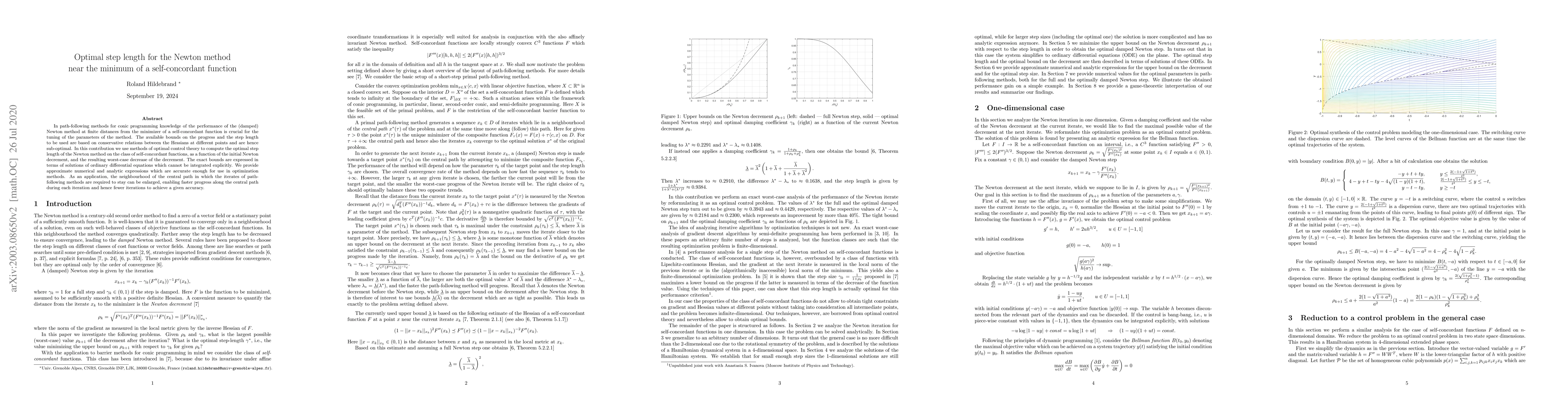 In path-following methods for conic programming knowledge of the performance of the (damped) Newton method at finite distances from the minimizer of a self-concordant function is crucial for the tuning of the parameters of the method. The available bounds on the progress and the step length to be used are based on conservative relations between the Hessians at different points and are hence sub-optimal. In this contribution we use methods of optimal control theory to compute the optimal step length of the Newton method on the class of self-concordant functions, as a function of the initial Newton decrement, and the resulting worst-case decrease of the decrement. The exact bounds are expressed in terms of solutions of ordinary differential equations which cannot be integrated explicitly. We provide approximate numerical and analytic expressions which are accurate enough for use in optimization methods. As an application, the neighbourhood of the central path in which the iterates of path-following methods are required to stay can be enlarged, enabling faster progress along the central path during each iteration and hence fewer iterations to achieve a given accuracy.