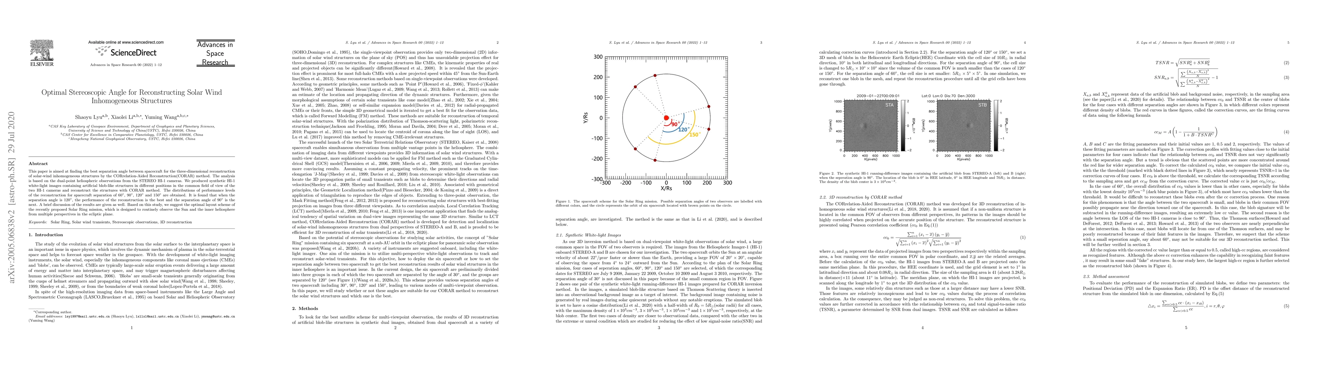 This paper is aimed at finding the best separation angle between spacecraft for the three-dimensional reconstruction of solar-wind inhomogeneous structures by the CORrelation-Aided Reconstruction(CORAR) method. The analysis is based on the dual-point heliospheric observations from the STEREO HI-1 cameras. We produced synthetic HI-1 white-light images containing artificial blob-like structures in different positions in the common field of view of the two HI-1 cameras and reconstruct the structures with CORAR method. The distributions of performance levels of the reconstruction for spacecraft separation of $60^{\circ}$, $90^{\circ}$, $120^{\circ}$ and $150^{\circ}$ are obtained. It is found that when the separation angle is $120^{\circ}$, the performance of the reconstruction is the best and the separation angle of $90^{\circ}$ is the next. A brief discussion of the results are given as well. Based on this study, we suggest the optimal layout scheme of the recently proposed Solar Ring mission, which is designed to routinely observe the Sun and the inner heliosphere from multiple perspectives in the ecliptic plane.