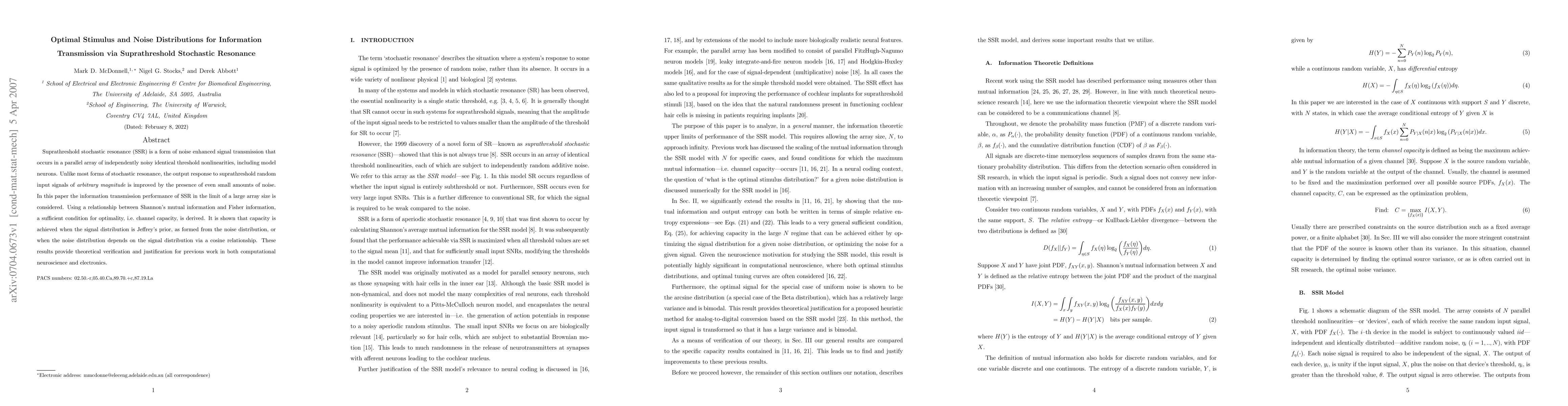 This paper investigates optimal signal and noise distributions for suprathreshold stochastic resonance, demonstrating that channel capacity is achieved when the signal distribution is Jeffrey's prior or when noise follows a cosine relationship with the signal distribution. This provides theoretical insights into noise-enhanced signal transmission in noisy systems.