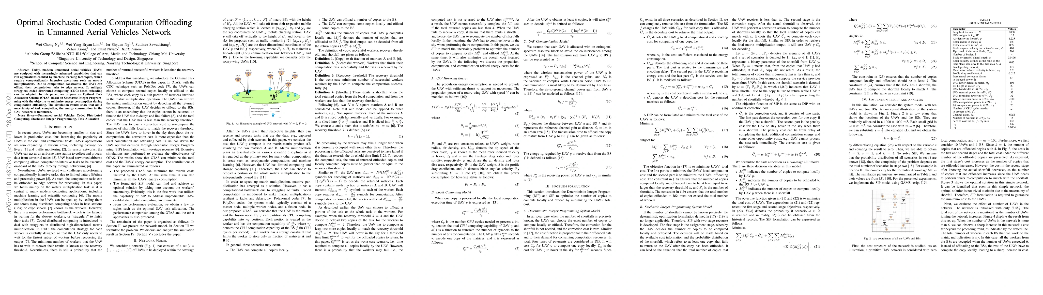 This paper proposes an Optimal Task Allocation Scheme (OTAS) using Stochastic Integer Programming for UAVs to minimize energy consumption during computation offloading to edge servers, leveraging coded distributed computing to mitigate stragglers. Simulation results demonstrate reduced energy consumption under task completion uncertainties.