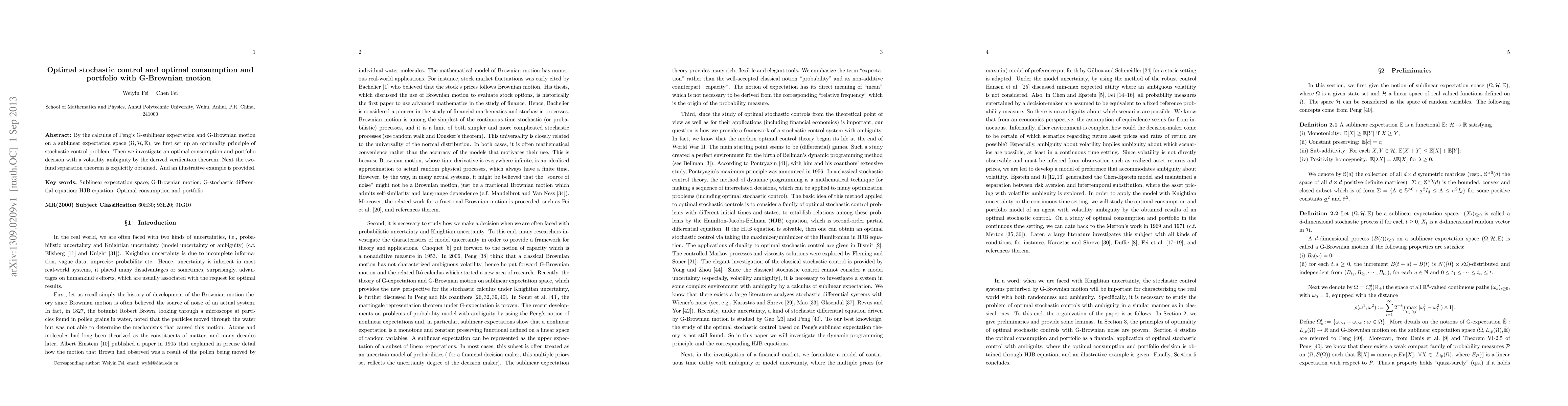 This paper establishes an optimality principle for stochastic control using Peng's G-sublinear expectation and G-Brownian motion. It then applies this framework to derive optimal consumption and portfolio strategies under volatility ambiguity, concluding with a two-fund separation theorem and an illustrative example.