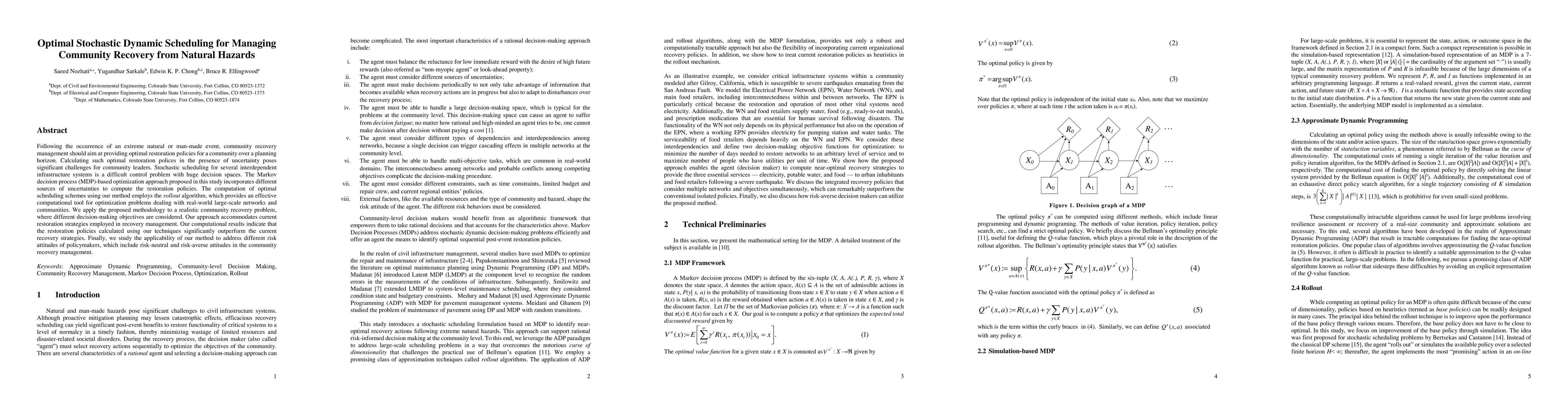 This paper proposes an MDP-based optimization approach to determine optimal restoration policies for community recovery from natural hazards, employing the rollout algorithm to handle large-scale networks. The method significantly outperforms current recovery strategies and accommodates various risk attitudes of policymakers.