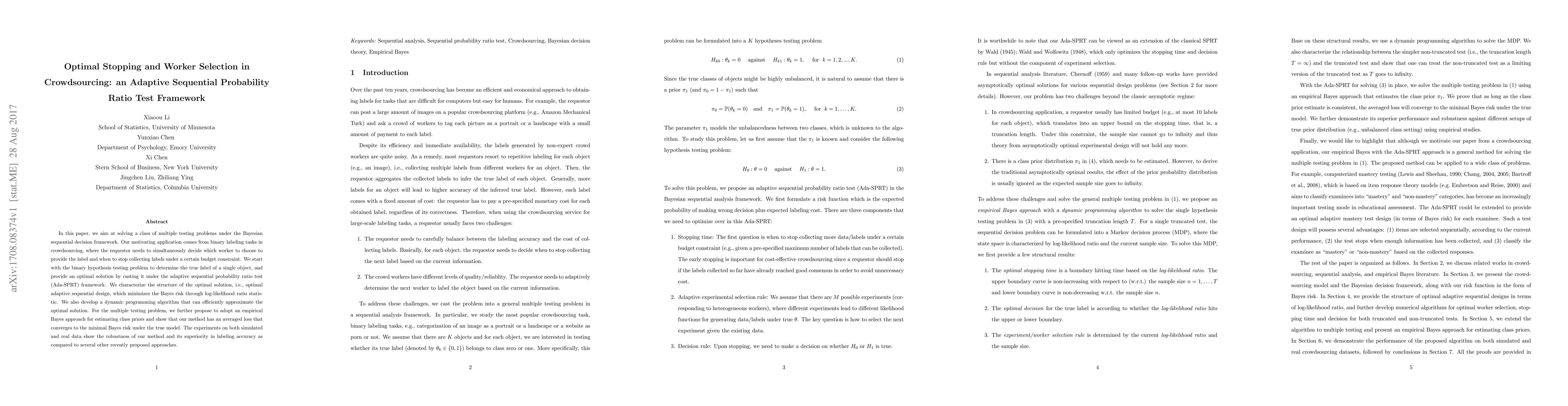 This paper proposes an adaptive sequential probability ratio test (Ada-SPRT) framework to optimally select workers and determine when to stop collecting labels in crowdsourcing tasks under budget constraints. The method minimizes Bayes risk through log-likelihood ratio statistics and demonstrates superior labeling accuracy compared to other approaches, as shown through experiments on simulated and real data.