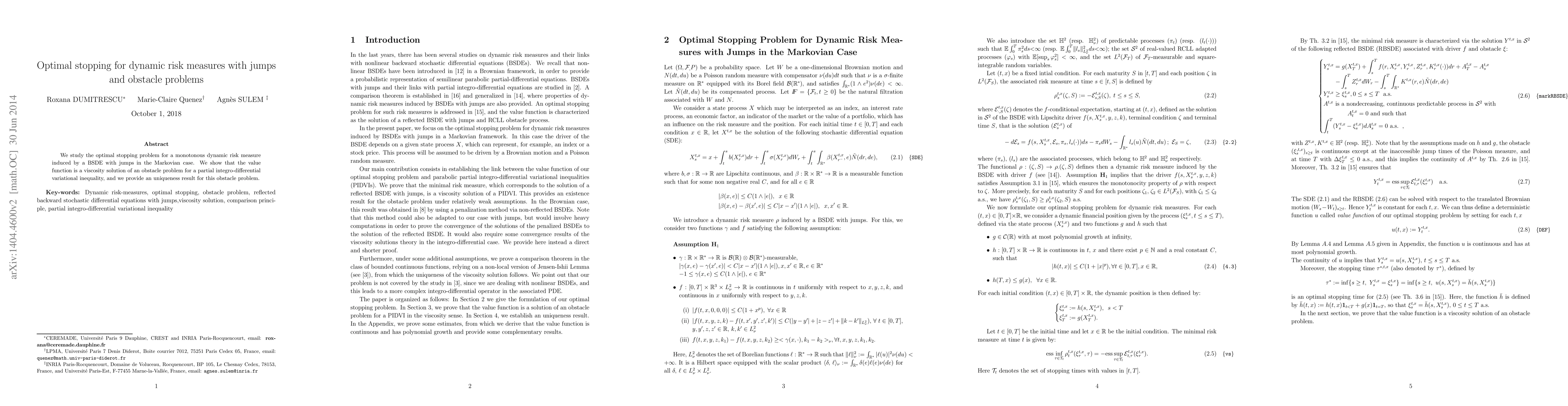 This paper investigates optimal stopping for dynamic risk measures in a Markovian setting with jumps, demonstrating that the value function is a viscosity solution to an obstacle problem governed by a partial integro-differential variational inequality, and establishes uniqueness for this problem.