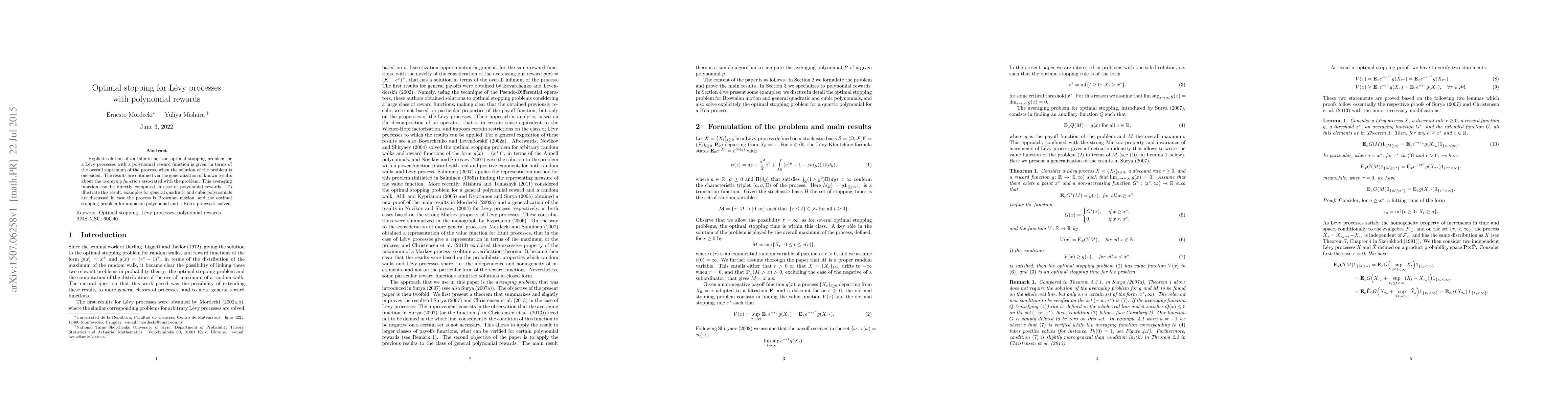 This paper provides an explicit solution for the optimal stopping problem for Lévy processes with polynomial rewards, deriving results in terms of the supremum of the process. The solution is demonstrated through examples involving quadratic, cubic, and quartic polynomials, particularly for Brownian motion and Kou's process.