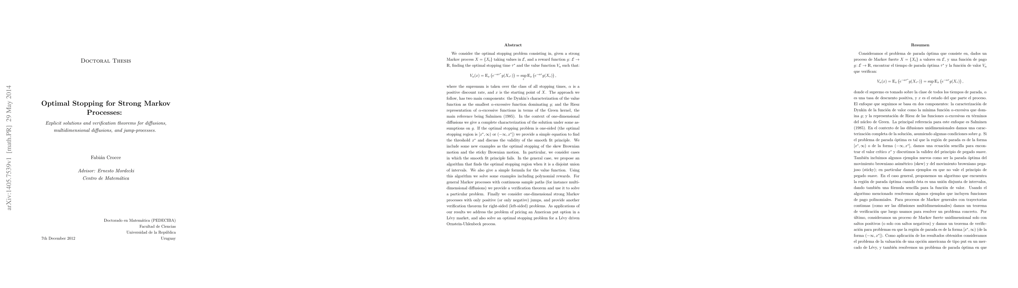 This paper explores optimal stopping problems for various strong Markov processes, including diffusions, multidimensional diffusions, and jump-processes. It provides explicit solutions and verification theorems, employing Dynkin's characterization and the Riesz representation, and includes applications such as pricing American put options and solving optimal stopping problems for Lévy-driven processes.