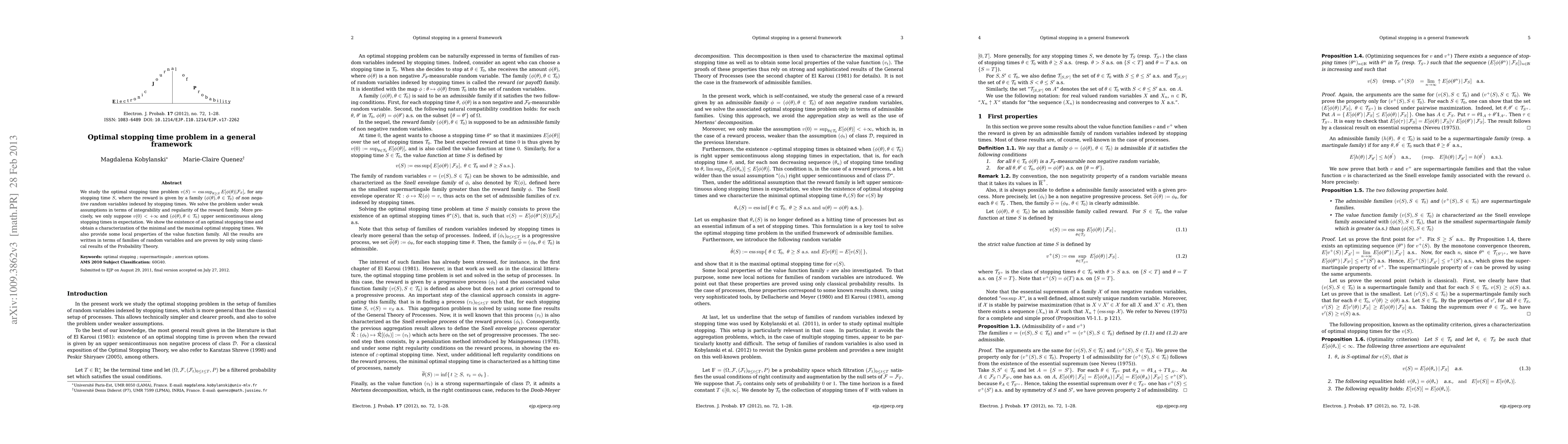 We study the optimal stopping time problem $v(S)={\rm ess}\sup_{\theta \geq S} E[\phi(\theta)|\mathcal {F}_S]$, for any stopping time $S$, where the reward is given by a family $(\phi(\theta),\theta\in\mathcal{T}_0)$ \emph{of non negative random variables} indexed by stopping times. We solve the problem under weak assumptions in terms of integrability and regularity of the reward family. More precisely, we only suppose $v(0) < + \infty$ and $ (\phi(\theta),\theta\in \mathcal{T}_0)$ upper semicontinuous along stopping times in expectation. We show the existence of an optimal stopping time and obtain a characterization of the minimal and the maximal optimal stopping times. We also provide some local properties of the value function family. All the results are written in terms of families of random variables and are proven by only using classical results of the Probability Theory.