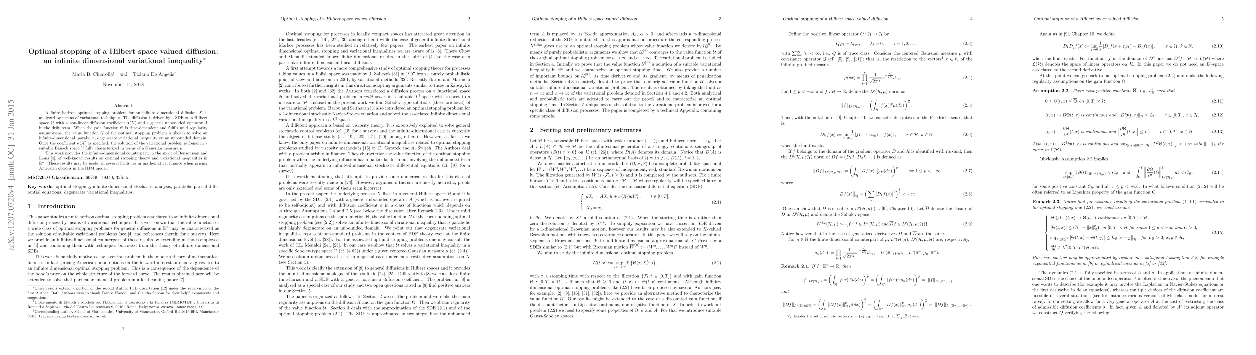 This paper analyzes optimal stopping problems for infinite-dimensional diffusions using variational techniques, showing that the value function solves an infinite-dimensional variational inequality. The results extend optimal stopping theory to Hilbert spaces and may aid in pricing American options in mathematical finance.