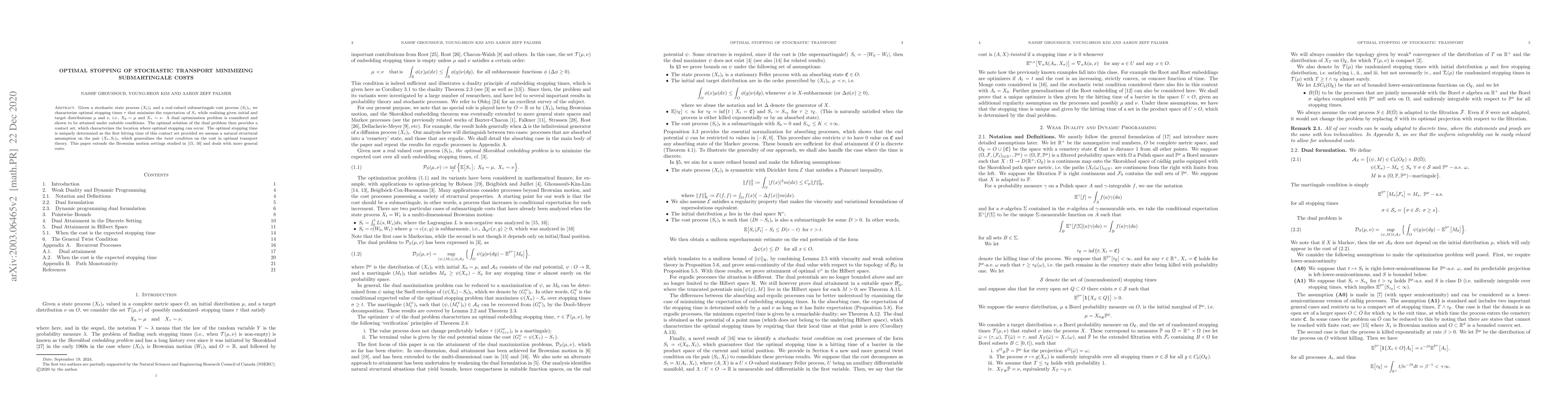 Given a stochastic state process $(X_t)_t$ and a real-valued submartingale cost process $(S_t)_t$, we characterize optimal stopping times $\tau$ that minimize the expectation of $S_\tau$ while realizing given initial and target distributions $\mu$ and $\nu$, i.e., $X_0\sim \mu$ and $X_\tau \sim \nu$. A dual optimization problem is considered and shown to be attained under suitable conditions. The optimal solution of the dual problem then provides a contact set, which characterizes the location where optimal stopping can occur. The optimal stopping time is uniquely determined as the first hitting time of this contact set provided we assume a natural structural assumption on the pair $(X_t, S_t)_t$, which generalizes the twist condition on the cost in optimal transport theory. This paper extends the Brownian motion settings studied in [15, 16] and deals with more general costs.