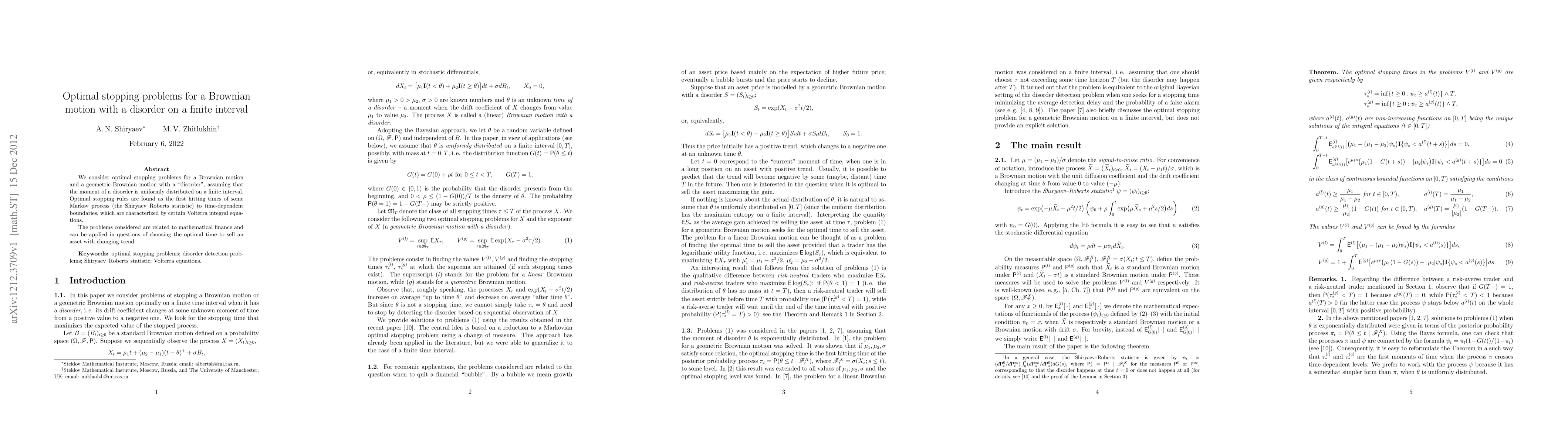 This paper addresses optimal stopping problems for Brownian motion with a disorder uniformly distributed on a finite interval, finding solutions as first hitting times to time-dependent boundaries defined by Volterra integral equations. The results have applications in mathematical finance for determining the best time to sell an asset with a changing trend.