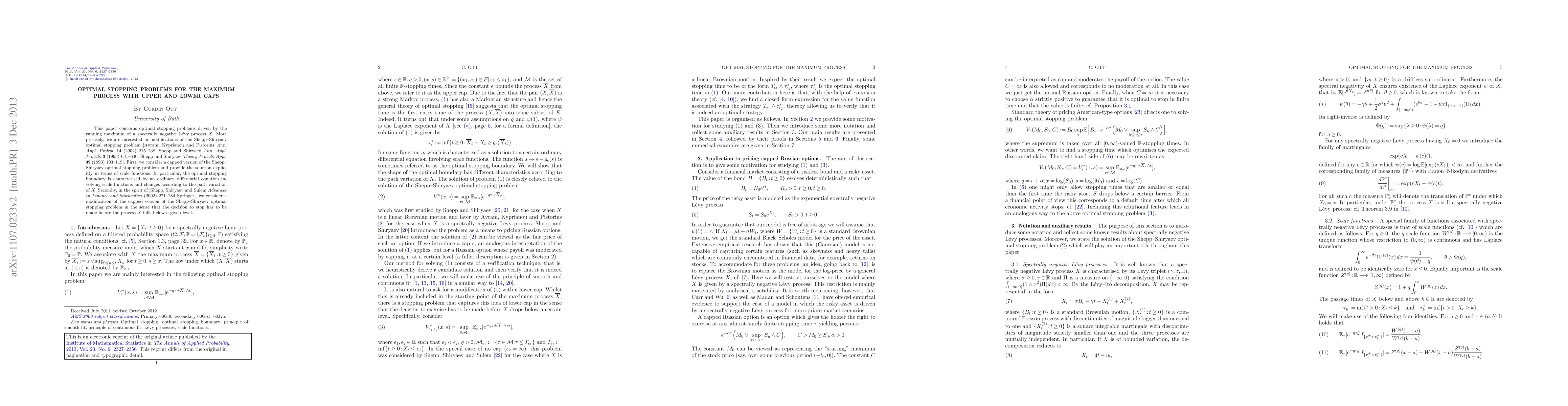 This paper addresses optimal stopping problems for the running maximum of a spectrally negative Lévy process with upper and lower caps, solving a capped Shepp-Shiryaev problem explicitly and characterizing the optimal stopping boundary via an ODE. It also extends this to scenarios where a stopping decision must be made before the process falls below a specified level.