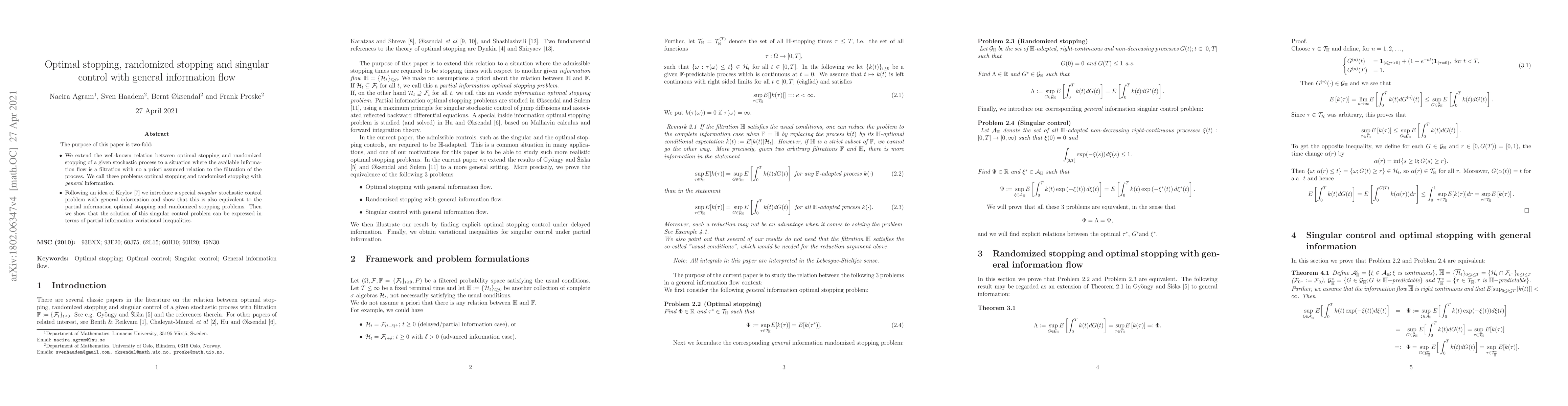The purpose of this paper is two-fold: We extend the well-known relation between optimal stopping and randomized stopping of a given stochastic process to a situation where the available information flow is a filtration with no a priori assumed relation to the filtration of the process. We call these problems optimal stopping and randomized stopping with general information. Following an idea of Krylov [K] we introduce a special singular stochastic control problem with general information and show that this is also equivalent to the partial information optimal stopping and randomized stopping problems. Then we show that the solution of this singular control problem can be expressed in terms of partial information variational inequalities.