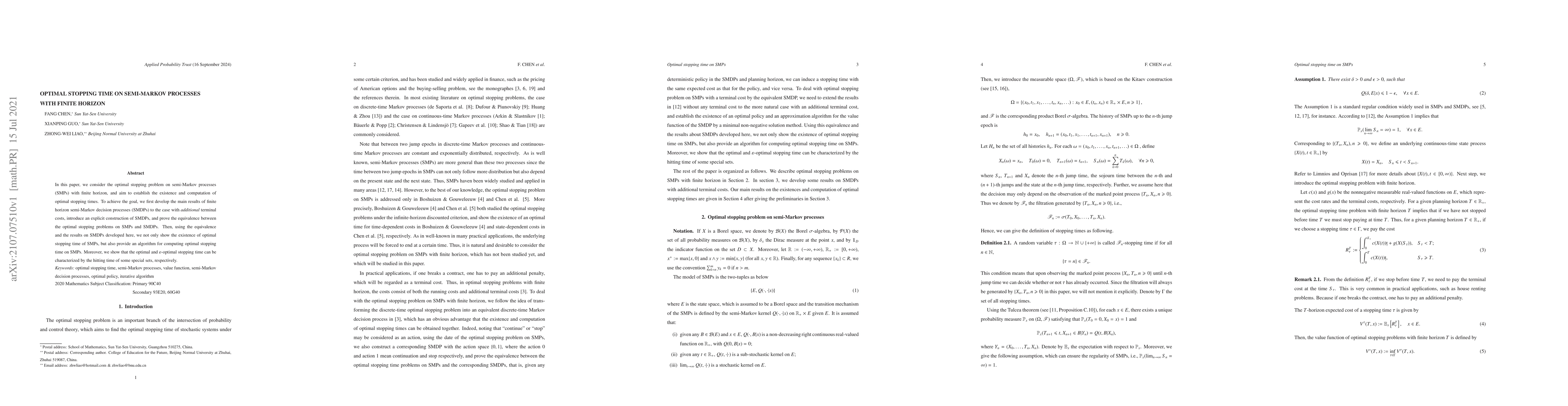 This paper establishes the existence and computation of optimal stopping times for semi-Markov processes with finite horizon. It develops results for finite horizon semi-Markov decision processes, proves equivalence between SMP and SMDP optimal stopping problems, and provides an algorithm for computing optimal stopping times.