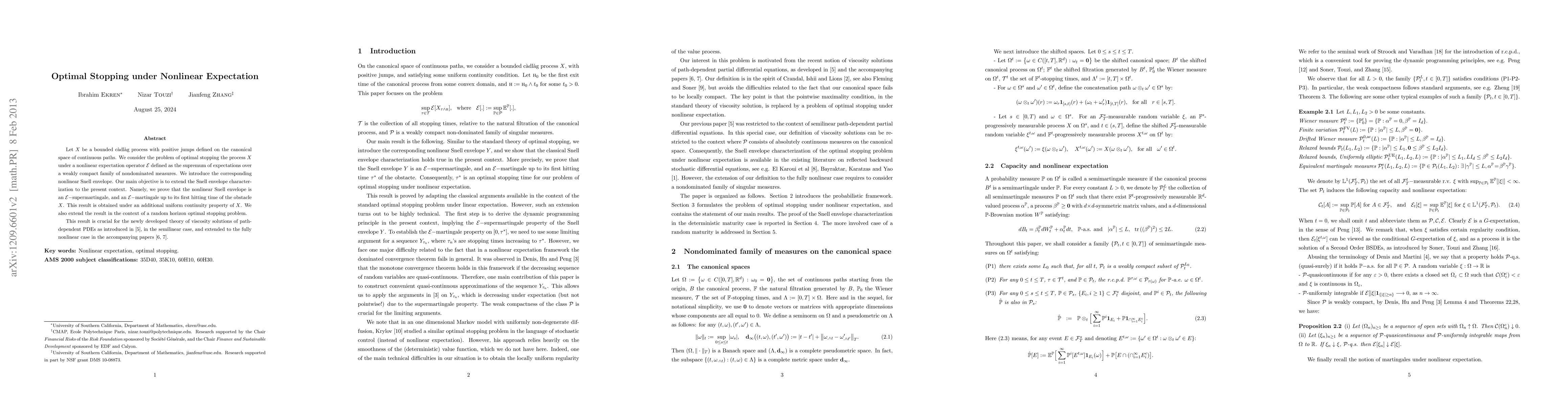 Let $X$ be a bounded c\`adl\`ag process with positive jumps defined on the canonical space of continuous paths. We consider the problem of optimal stopping the process $X$ under a nonlinear expectation operator $\cE$ defined as the supremum of expectations over a weakly compact family of nondominated measures. We introduce the corresponding nonlinear Snell envelope. Our main objective is to extend the Snell envelope characterization to the present context. Namely, we prove that the nonlinear Snell envelope is an $\cE-$supermartingale, and an $\cE-$martingale up to its first hitting time of the obstacle $X$. This result is obtained under an additional uniform continuity property of $X$. We also extend the result in the context of a random horizon optimal stopping problem. This result is crucial for the newly developed theory of viscosity solutions of path-dependent PDEs as introduced in Ekren et al., in the semilinear case, and extended to the fully nonlinear case in the accompanying papers (Ekren, Touzi, and Zhang, parts I and II).