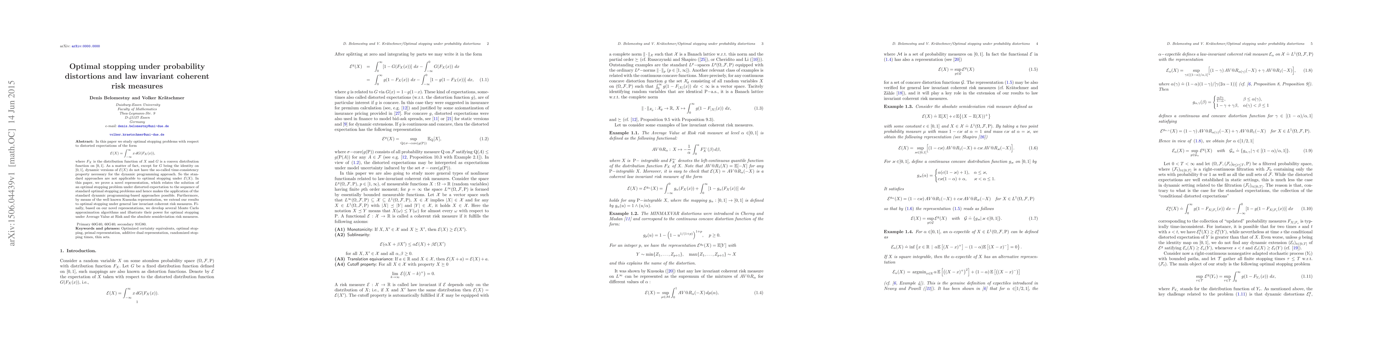 In this paper we study optimal stopping problems with respect to distorted expectations of the form \begin{eqnarray*} \mathcal{E}(X)=\int_{-\infty}^{\infty} x\,dG(F_X(x)), \end{eqnarray*} where $F_X$ is the distribution function of $X$ and $G$ is a convex distribution function on $[0,1].$ As a matter of fact, except for $G$ being the identity on $[0,1],$ dynamic versions of $\mathcal{E}(X)$ do not have the so-called time-consistency property necessary for the dynamic programming approach. So the standard approaches are not applicable to optimal stopping under $\mathcal{E}(X).$ In this paper, we prove a novel representation, which relates the solution of an optimal stopping problem under distorted expectation to the sequence of standard optimal stopping problems and hence makes the application of the standard dynamic programming-based approaches possible. Furthermore, by means of the well known Kusuoka representation, we extend our results to optimal stopping under general law invariant coherent risk measures. Finally, based on our novel representations, we develop several Monte Carlo approximation algorithms and illustrate their power for optimal stopping under Average Value at Risk and the absolute semideviation risk measures.