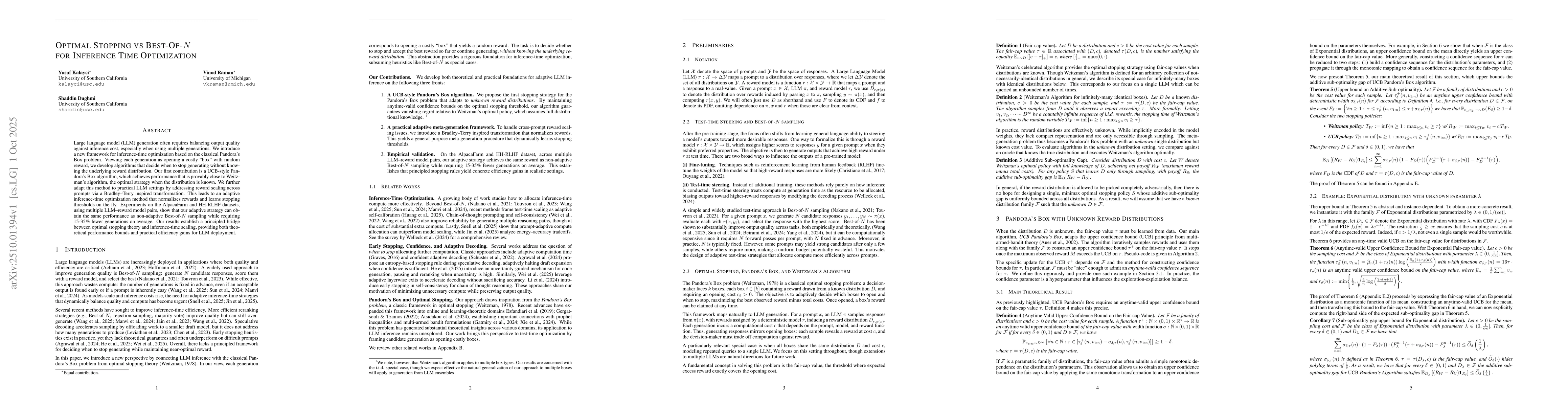 Large language model (LLM) generation often requires balancing output quality against inference cost, especially when using multiple generations. We introduce a new framework for inference-time optimization based on the classical Pandora's Box problem. Viewing each generation as opening a costly "box" with random reward, we develop algorithms that decide when to stop generating without knowing the underlying reward distribution. Our first contribution is a UCB-style Pandora's Box algorithm, which achieves performance that is provably close to Weitzman's algorithm, the optimal strategy when the distribution is known. We further adapt this method to practical LLM settings by addressing reward scaling across prompts via a Bradley-Terry inspired transformation. This leads to an adaptive inference-time optimization method that normalizes rewards and learns stopping thresholds on the fly. Experiments on the AlpacaFarm and HH-RLHF datasets, using multiple LLM-reward model pairs, show that our adaptive strategy can obtain the same performance as non-adaptive Best-of-N sampling while requiring 15-35 percent fewer generations on average. Our results establish a principled bridge between optimal stopping theory and inference-time scaling, providing both theoretical performance bounds and practical efficiency gains for LLM deployment.