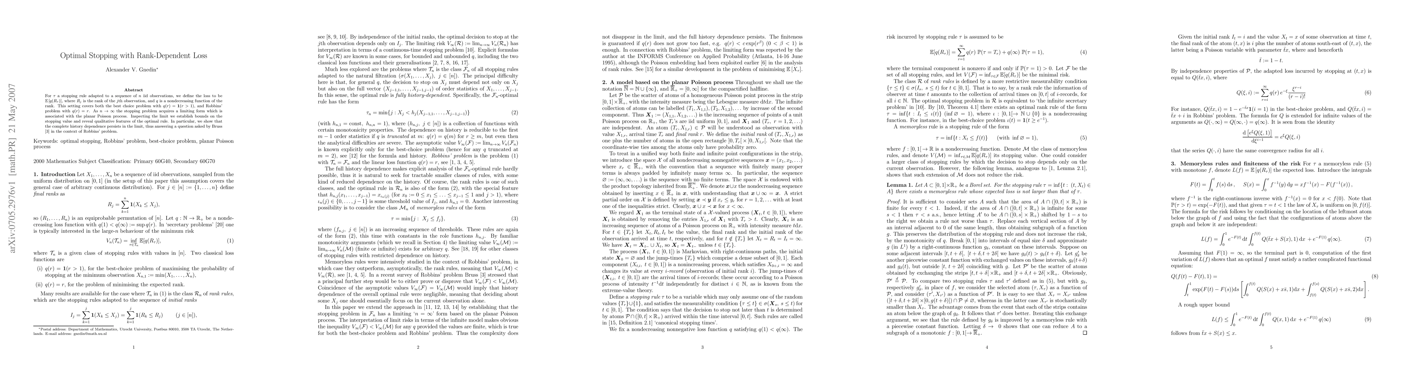 This paper investigates optimal stopping strategies under rank-dependent loss, where the loss function depends on the rank of observations. It establishes bounds on the stopping value and reveals that the complete history dependence persists even in the limit as the number of observations approaches infinity, addressing a question posed by Bruss.