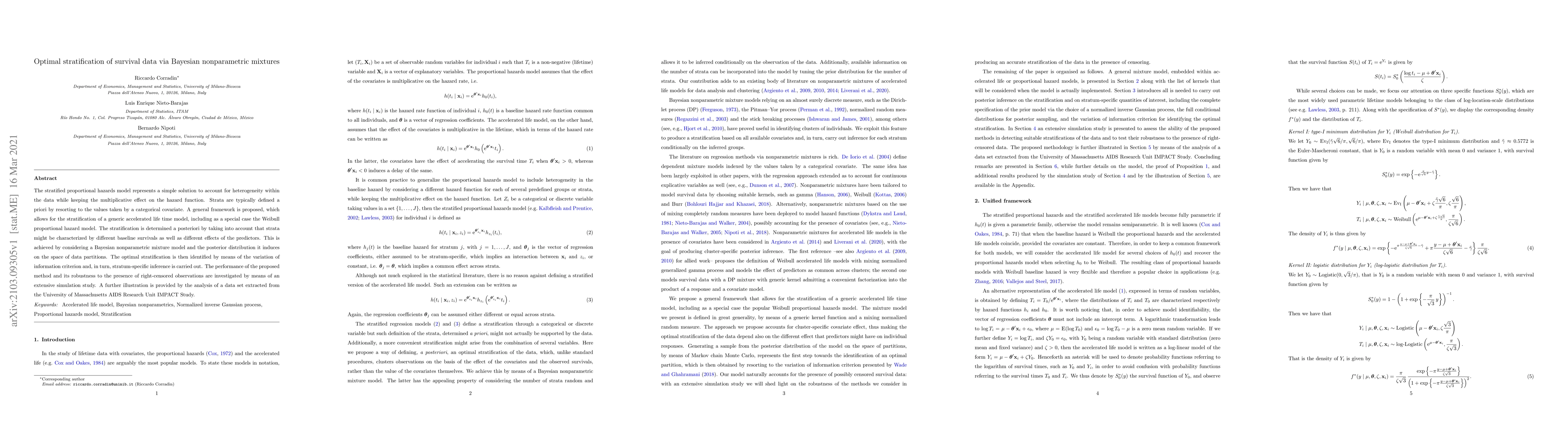 This paper proposes a Bayesian nonparametric mixture model for optimal stratification of survival data, allowing for a posteriori determination of strata based on baseline survivals and predictor effects. The method is evaluated through simulations and applied to an AIDS Research Unit dataset.