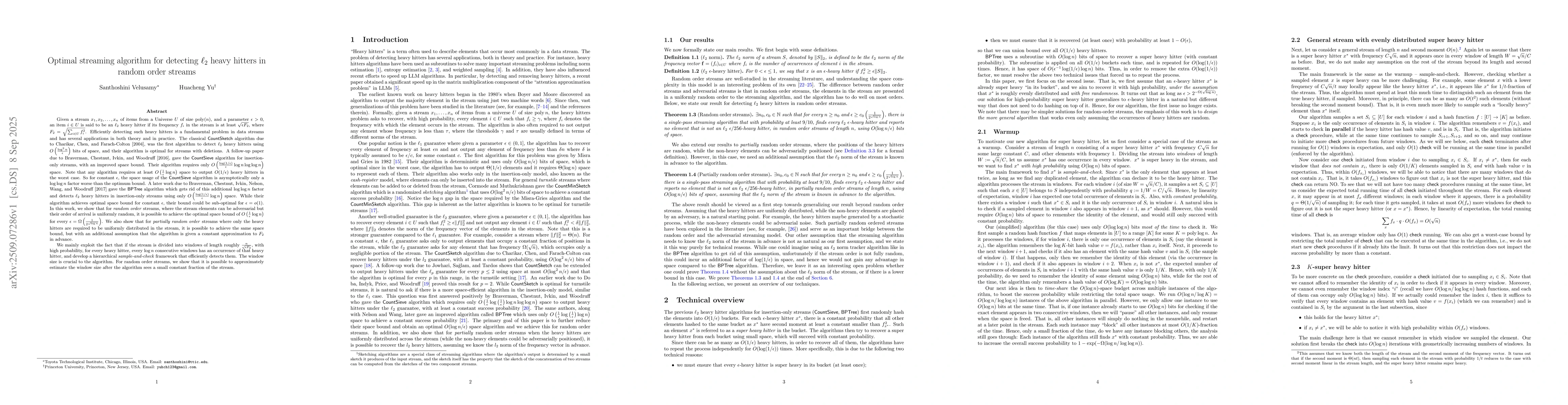 Given a stream $x_1,x_2,\dots,x_n$ of items from a Universe $U$ of size $\mathsf{poly}(n)$, and a parameter $\epsilon>0$, an item $i\in U$ is said to be an $\ell_2$ heavy hitter if its frequency $f_i$ in the stream is at least $\sqrt{\epsilon F_2}$, where $F_2=\sqrt{\sum_{i\in U} f_i^2}$. The classical $\mathsf{CountSketch}$ algorithm due to Charikar, Chen, and Farach-Colton [2004], was the first algorithm to detect $\ell_2$ heavy hitters using $O\left(\frac{\log^2 n}{\epsilon}\right)$ bits of space, and their algorithm is optimal for streams with deletions. For insertion-only streams, Braverman, Chestnut, Ivkin, Nelson, Wang, and Woodruff [2017] gave the $\mathsf{BPTree}$ algorithm which requires only $O\left(\frac{\log(1/\epsilon)}{\epsilon}\log n \right)$ space. Note that any algorithm requires at least $O\left(\frac{1}{\epsilon} \log n\right)$ space to output $O(1/\epsilon)$ heavy hitters in the worst case. So for constant $\epsilon$, the space usage of the $\mathsf{BPTree}$ algorithm is optimal but their bound could be sub-optimal for $\epsilon=o(1)$. In this work, we show that for random order streams, where the stream elements can be adversarial but their order of arrival is uniformly random, it is possible to achieve the optimal space bound of $O\left(\frac{1}{\epsilon} \log n\right)$ for every $\epsilon = \Omega\left(\frac{1}{2^{\sqrt{\log n}}}\right)$. We also show that for partially random order streams where only the heavy hitters are required to be uniformly distributed in the stream, it is possible to achieve the same space bound, but with an additional assumption that the algorithm is given a constant approximation to $F_2$ in advance.