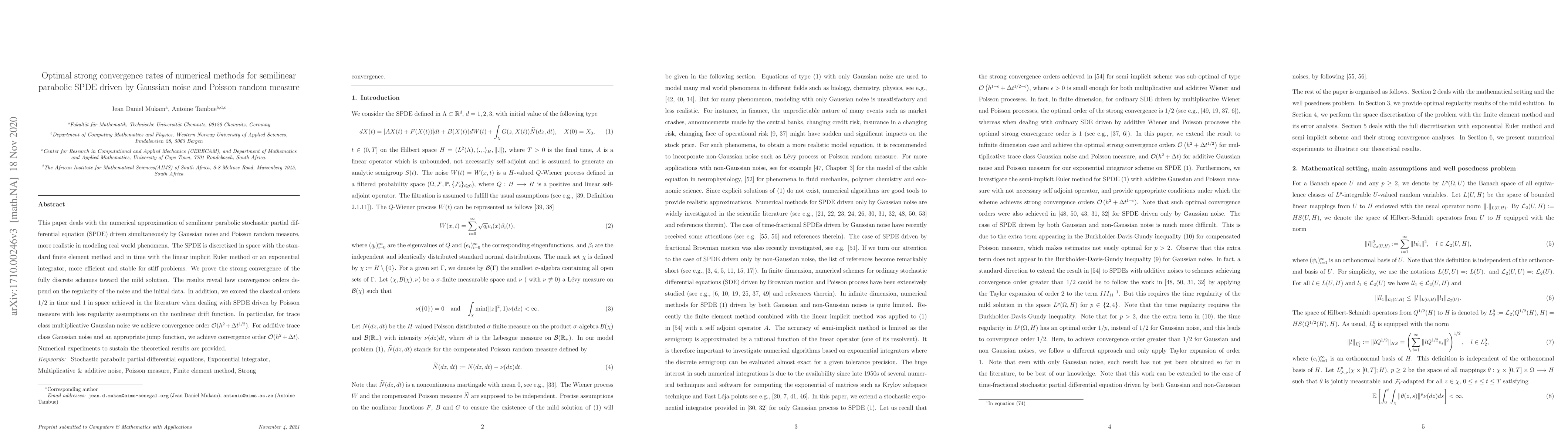 This paper investigates numerical methods for semilinear parabolic SPDEs driven by Gaussian noise and Poisson random measures, achieving optimal strong convergence rates. The study demonstrates improved convergence orders beyond classical results, particularly $\mathcal{O}(h^2+\Delta t^{1/2})$ for trace class multiplicative Gaussian noise. Numerical experiments validate the theoretical findings.