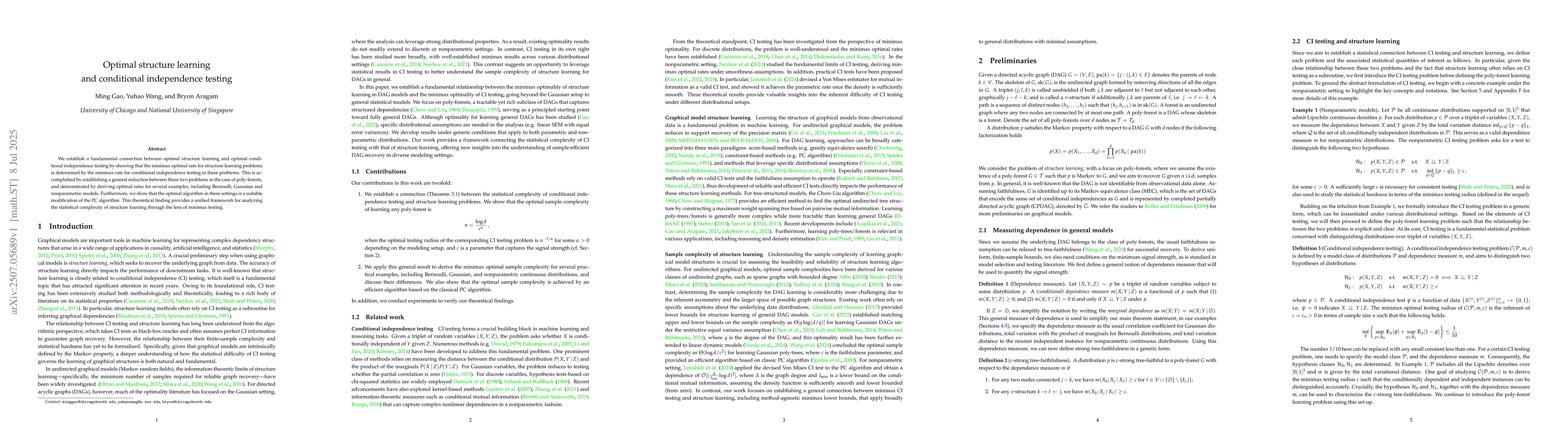 We establish a fundamental connection between optimal structure learning and optimal conditional independence testing by showing that the minimax optimal rate for structure learning problems is determined by the minimax rate for conditional independence testing in these problems. This is accomplished by establishing a general reduction between these two problems in the case of poly-forests, and demonstrated by deriving optimal rates for several examples, including Bernoulli, Gaussian and nonparametric models. Furthermore, we show that the optimal algorithm in these settings is a suitable modification of the PC algorithm. This theoretical finding provides a unified framework for analyzing the statistical complexity of structure learning through the lens of minimax testing.