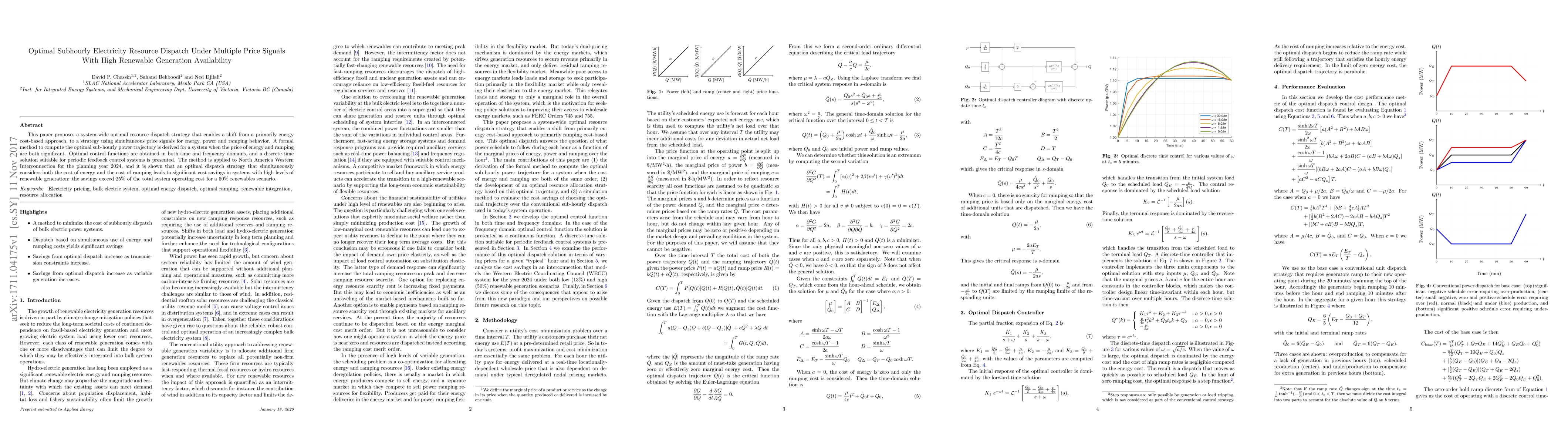 This paper proposes a system-wide optimal resource dispatch strategy that enables a shift from a primarily energy cost-based approach, to a strategy using simultaneous price signals for energy, power and ramping behavior. A formal method to compute the optimal sub-hourly power trajectory is derived for a system when the price of energy and ramping are both significant. Optimal control functions are obtained in both time and frequency domains, and a discrete-time solution suitable for periodic feedback control systems is presented. The method is applied to North America Western Interconnection for the planning year 2024, and it is shown that an optimal dispatch strategy that simultaneously considers both the cost of energy and the cost of ramping leads to significant cost savings in systems with high levels of renewable generation: the savings exceed 25% of the total system operating cost for a 50% renewables scenario.
