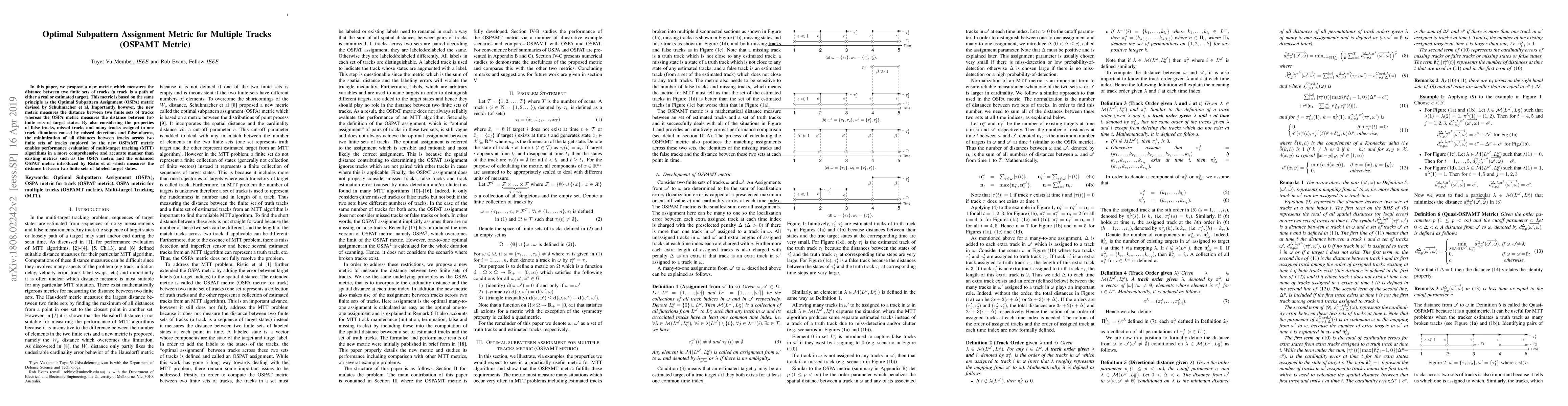A new metric called OSPAMT is proposed to measure distance between two sets of tracks in multi-target tracking, offering a more comprehensive evaluation than existing metrics.