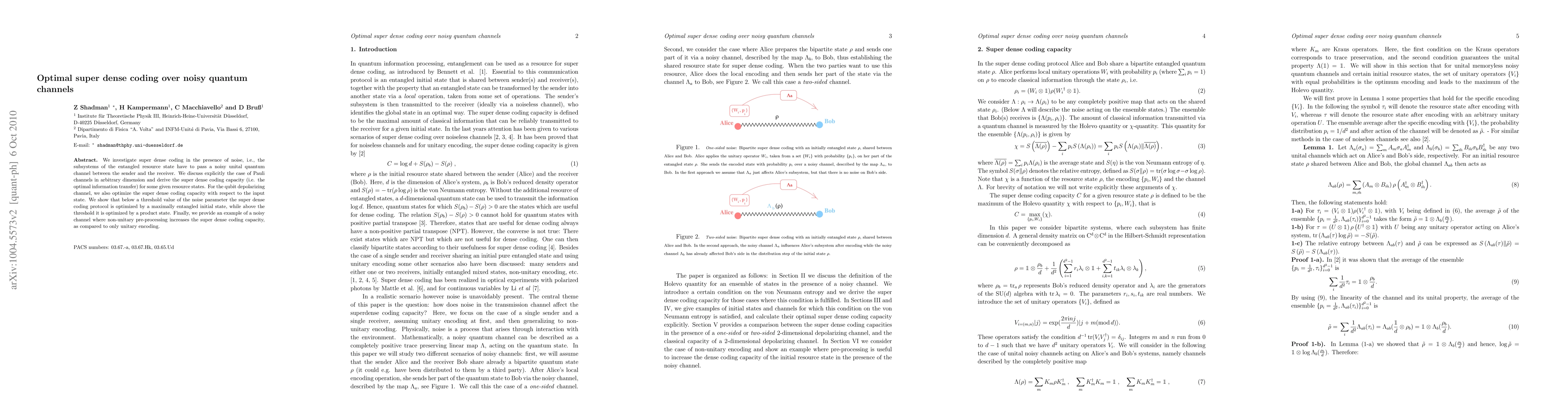 This paper explores super dense coding through noisy quantum channels, focusing on Pauli channels and deriving optimal information transfer capacities for various resource states. It reveals that for qubit depolarizing channels, maximally entangled states maximize capacity below a noise threshold, but product states are better above it, and demonstrates a scenario where non-unitary pre-processing enhances the coding capacity.