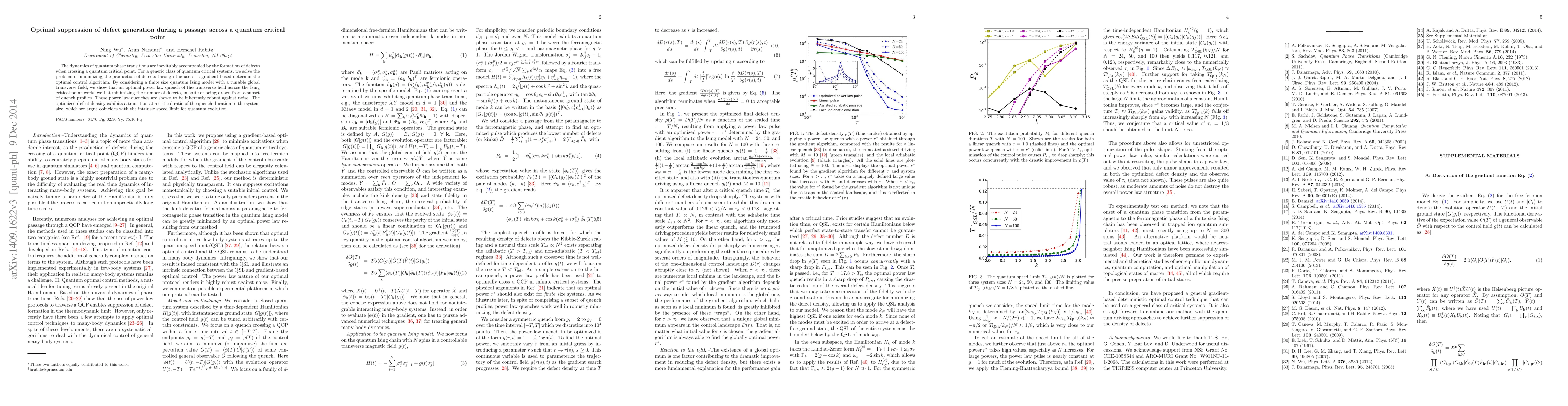 This paper explores minimizing defect generation during a quantum phase transition using optimal control. It demonstrates that an optimal power law quench of the transverse field in a quantum Ising model effectively reduces defect formation, showing robustness against noise and a critical transition in defect density linked to the intrinsic speed limit for quantum evolution.