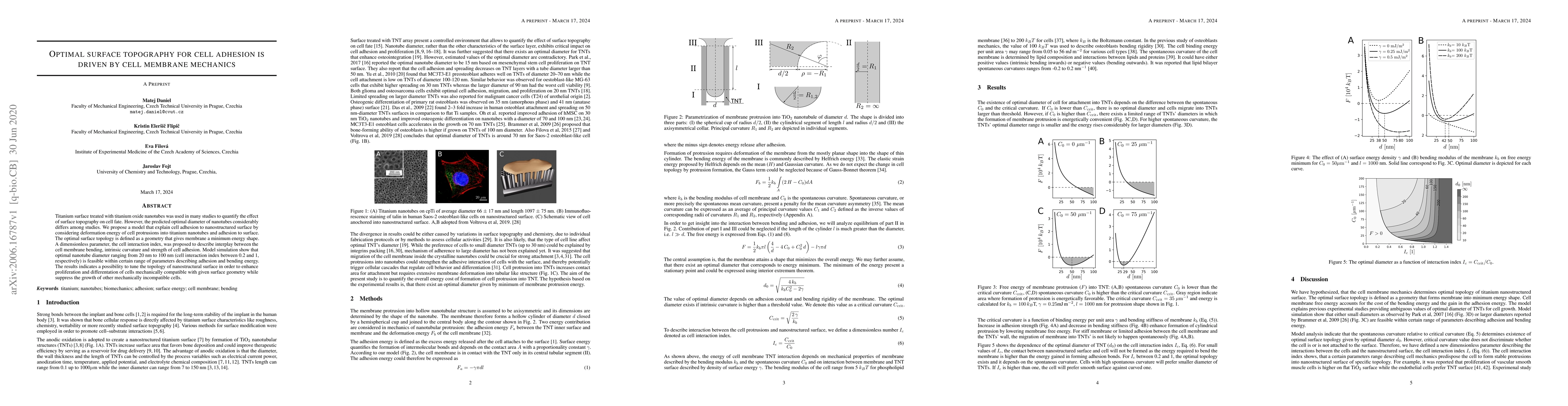 Titanium surface treated with titanium oxide nanotubes was used in many studies to quantify the effect of surface topography on cell fate. However, the predicted optimal diameter of nanotubes considerably differs among studies. We propose a model that explain cell adhesion to nanostructured surface by considering deformation energy of cell protrusions into titanium nanotubes and adhesion to surface. The optimal surface topology is defined as a geometry that gives membrane a minimum energy shape. A dimensionless parameter, the cell interaction index, was proposed to describe interplay between the cell membrane bending, intrinsic curvature and strength of cell adhesion. Model simulation show that optimal nanotube diameter ranging from 20 nm to 100 nm (cell interaction index between 0.2 and 1, respectively) is feasible within certain range of parameters describing adhesion and bending energy. The results indicates a possibility to tune the topology of nanostructural surface in order to enhance proliferation and differentation of cells mechanically compatible with given surface geometry while suppress the growth of other mechanically incompatible cells.
