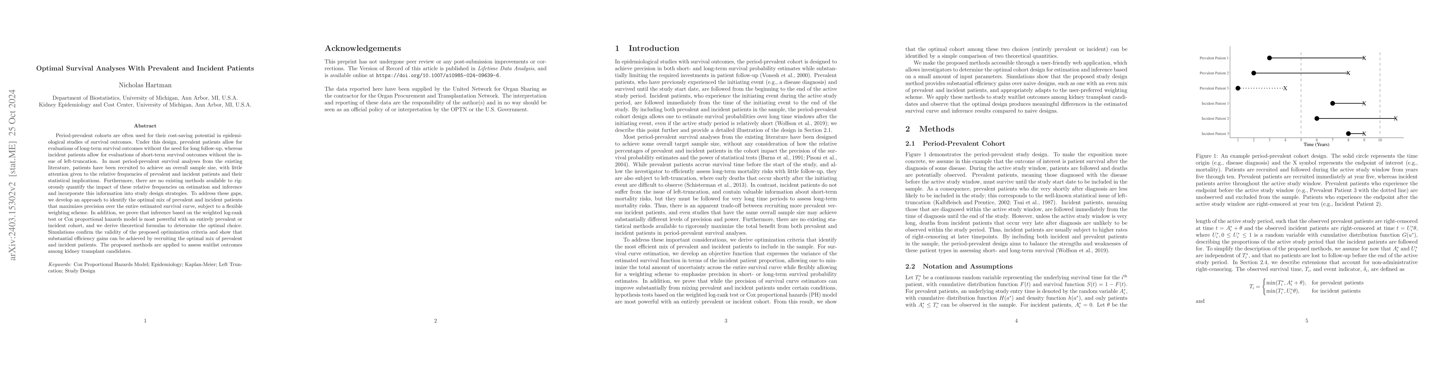 This paper develops a method to determine the optimal mix of prevalent and incident patients for period-prevalent survival analyses, showing that substantial efficiency gains can be achieved by balancing their frequencies. Simulations validate the approach, which is applied to kidney transplant candidate waitlist outcomes.