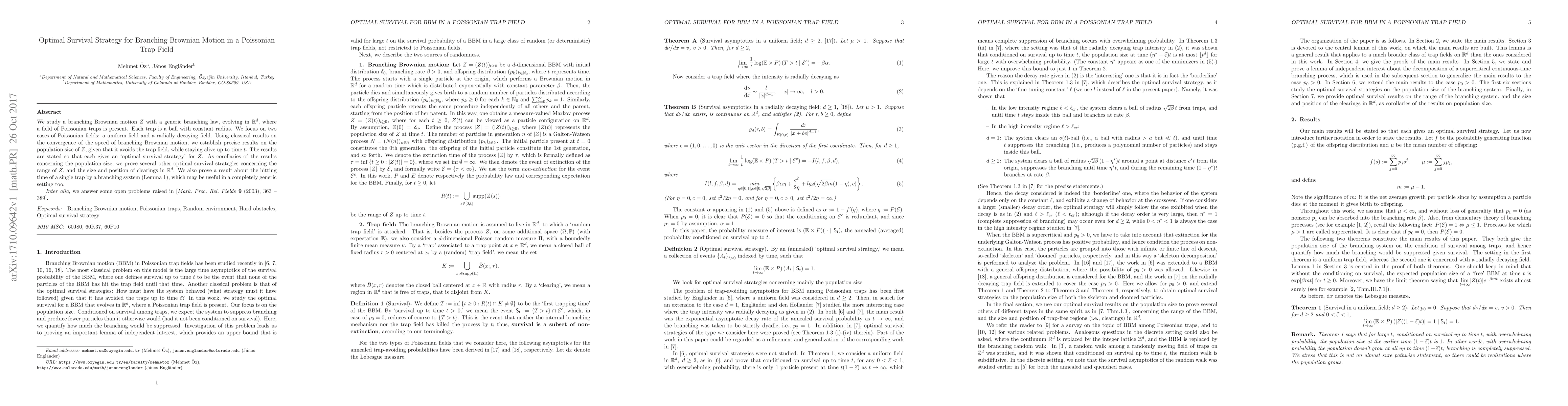 This paper investigates the optimal survival strategy for branching Brownian motion in a Poissonian trap field, focusing on two trap field configurations: uniform and radially decaying. It establishes precise results on population size, range, and clearings, providing optimal survival strategies and addressing open problems from previous research.