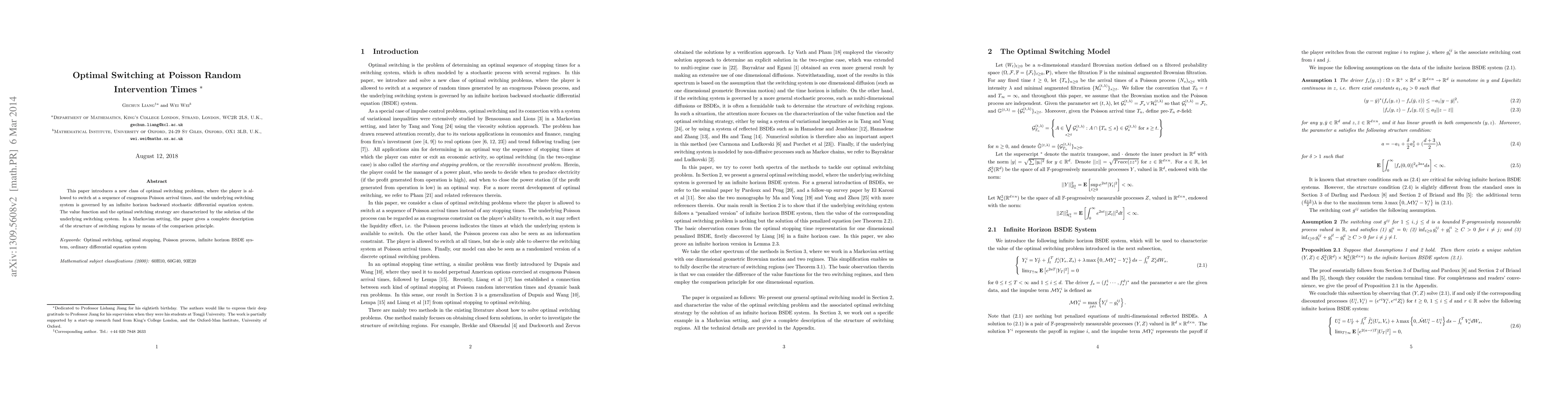 This paper introduces a new class of optimal switching problems, where the player is allowed to switch at a sequence of exogenous Poisson arrival times, and the underlying switching system is governed by an infinite horizon backward stochastic differential equation system. The value function and the optimal switching strategy are characterized by the solution of the underlying switching system. In a Markovian setting, the paper gives a complete description of the structure of switching regions by means of the comparison principle.