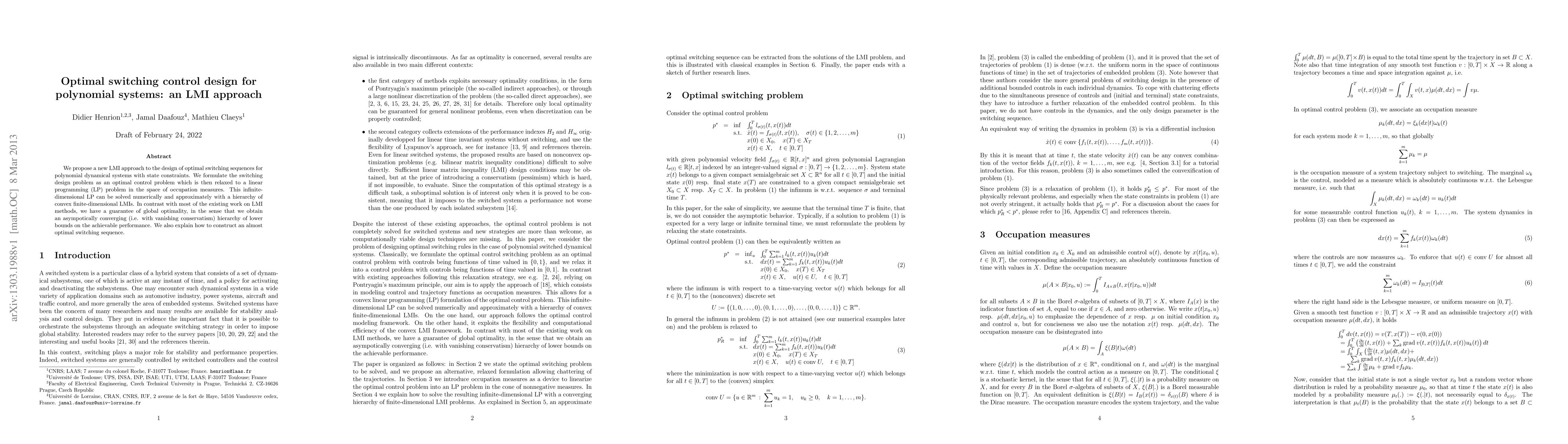This paper introduces an LMI approach for designing optimal switching sequences in polynomial dynamical systems with state constraints, transforming the problem into a linear programming problem solvable via a hierarchy of convex finite-dimensional LMIs. The method guarantees global optimality and provides a means to construct an almost optimal switching sequence.