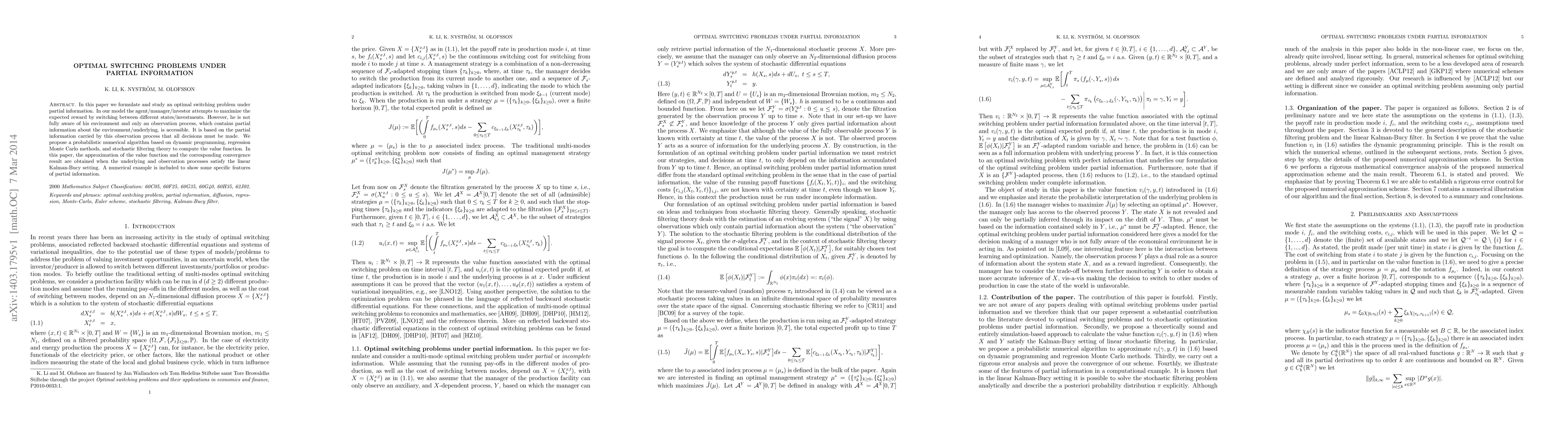 This paper formulates an optimal switching problem where an agent must maximize expected rewards by switching between states under partial information. The authors propose a probabilistic numerical algorithm combining dynamic programming, regression Monte Carlo, and stochastic filtering to compute the value function, demonstrating convergence in a linear Kalman-Bucy setting and illustrating with a numerical example.