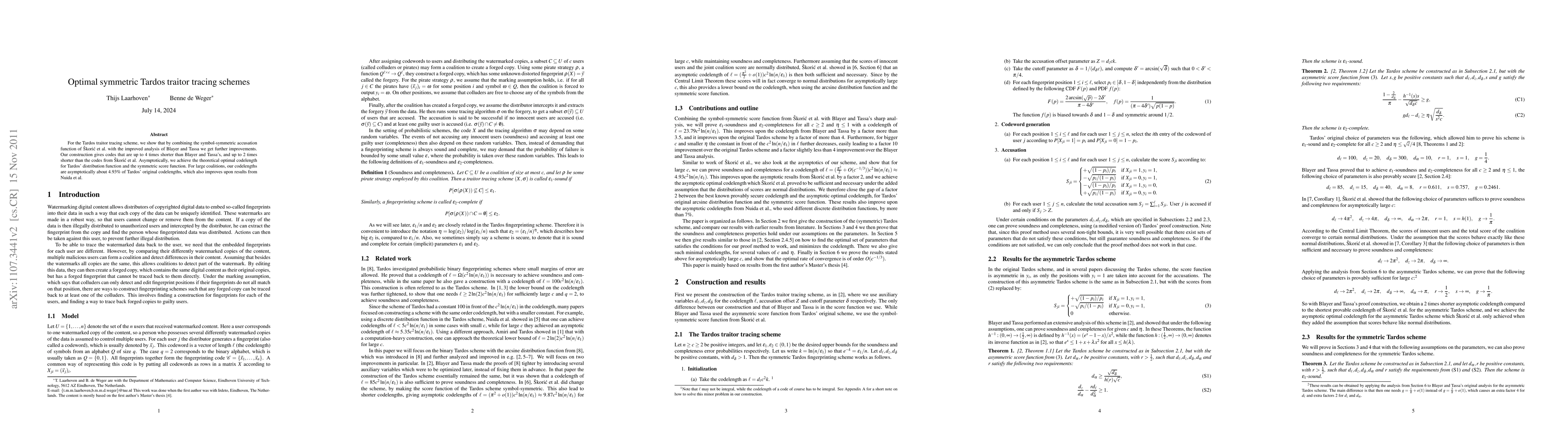 This paper presents an optimized symmetric Tardos traitor tracing scheme that combines symbol-symmetric accusations with improved analysis to achieve up to 4 times shorter codes than previous methods, while asymptotically reaching the theoretical optimal codelength for large coalitions.