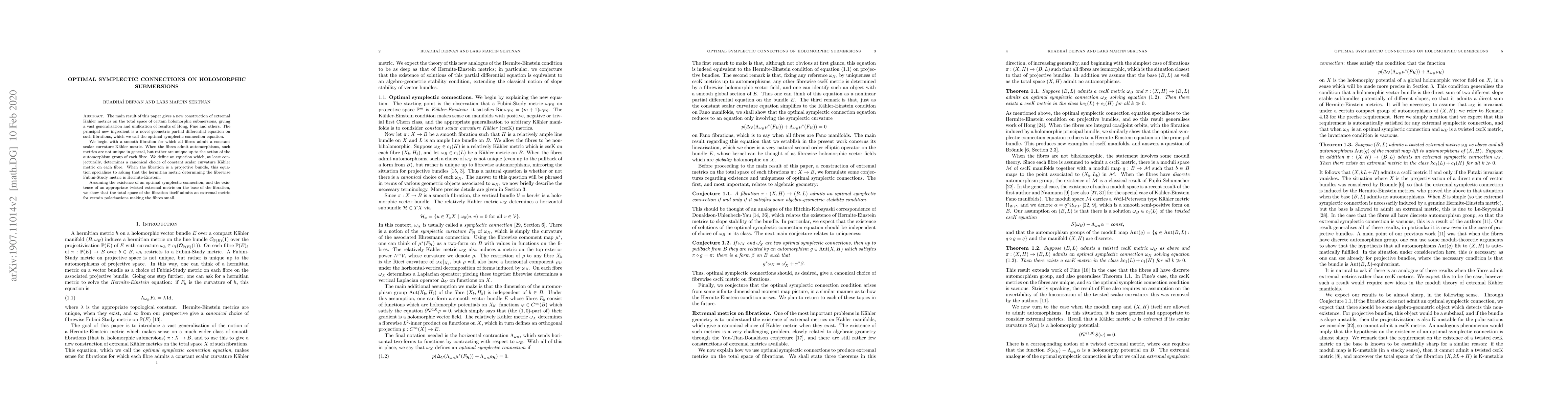 This paper constructs extremal Kähler metrics on holomorphic submersions using a novel geometric partial differential equation termed the optimal symplectic connection equation. The authors propose a canonical choice for constant scalar curvature Kähler metrics on fibres, leading to the existence of an extremal metric on the total space under certain polarisations.