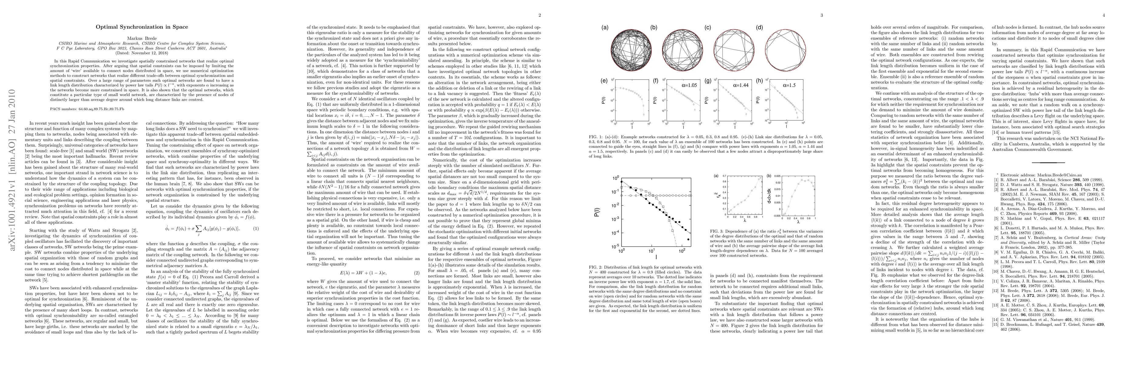In this Rapid Communication we investigate spatially constrained networks that realize optimal synchronization properties. After arguing that spatial constraints can be imposed by limiting the amount of `wire' available to connect nodes distributed in space, we use numerical optimization methods to construct networks that realize different trade-offs between optimal synchronization and spatial constraints. Over a large range of parameters such optimal networks are found to have a link length distribution characterized by power law tails $P(l)\propto l^{-\alpha}$, with exponents $\alpha$ increasing as the networks become more constrained in space. It is also shown that the optimal networks, which constitute a particular type of small world network, are characterized by the presence of nodes of distinctly larger than average degree around which long distance links are centred.