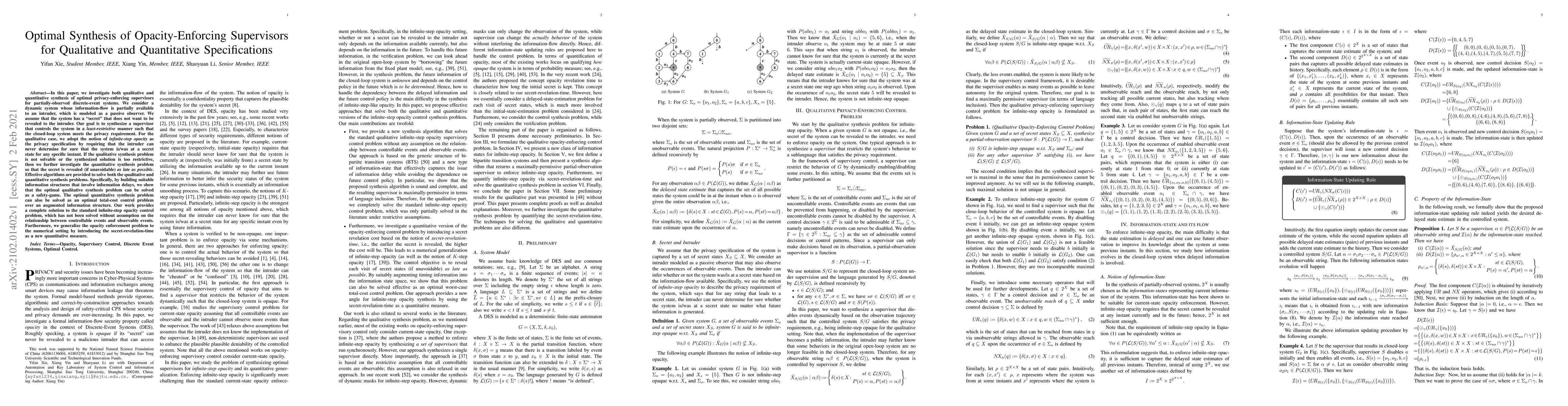In this paper, we investigate both qualitative and quantitative synthesis of optimal privacy-enforcing supervisors for partially-observed discrete-event systems. We consider a dynamic system whose information-flow is partially available to an intruder, which is modeled as a passive observer. We assume that the system has a "secret" that does not want to be revealed to the intruder. Our goal is to synthesize a supervisor that controls the system in a least-restrictive manner such that the closed-loop system meets the privacy requirement. For the qualitative case, we adopt the notion of infinite-step opacity as the privacy specification by requiring that the intruder can never determine for sure that the system is/was at a secret state for any specific instant. If the qualitative synthesis problem is not solvable or the synthesized solution is too restrictive, then we further investigate the quantitative synthesis problem so that the secret is revealed (if unavoidable) as late as possible. Effective algorithms are provided to solve both the qualitative and quantitative synthesis problems. Specifically, by building suitable information structures that involve information delays, we show that the optimal qualitative synthesis problem can be solved as a safety-game. The optimal quantitative synthesis problem can also be solved as an optimal total-cost control problem over an augmented information structure. Our work provides a complete solution to the standard infinite-step opacity control problem, which has not been solved without assumption on the relationship between controllable events and observable events. Furthermore, we generalize the opacity enforcement problem to the numerical setting by introducing the secret-revelation-time as a new quantitative measure.