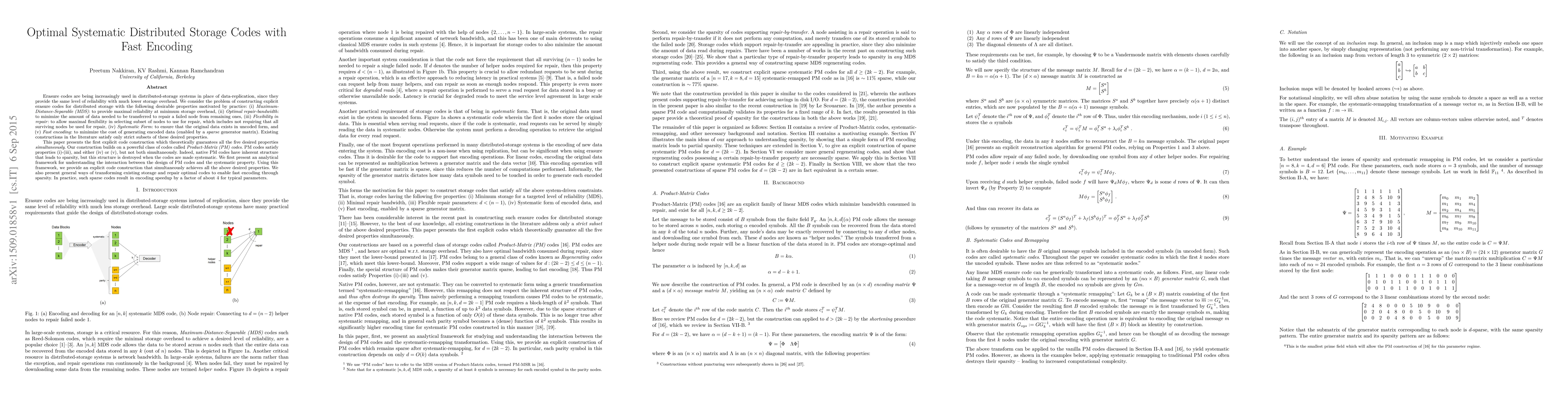 Erasure codes are being increasingly used in distributed-storage systems in place of data-replication, since they provide the same level of reliability with much lower storage overhead. We consider the problem of constructing explicit erasure codes for distributed storage with the following desirable properties motivated by practice: (i) Maximum-Distance-Separable (MDS): to provide maximal reliability at minimum storage overhead, (ii) Optimal repair-bandwidth: to minimize the amount of data needed to be transferred to repair a failed node from remaining ones, (iii) Flexibility in repair: to allow maximal flexibility in selecting subset of nodes to use for repair, which includes not requiring that all surviving nodes be used for repair, (iv) Systematic Form: to ensure that the original data exists in uncoded form, and (v) Fast encoding: to minimize the cost of generating encoded data (enabled by a sparse generator matrix). This paper presents the first explicit code construction which theoretically guarantees all the five desired properties simultaneously. Our construction builds on a powerful class of codes called Product-Matrix (PM) codes. PM codes satisfy properties (i)-(iii), and either (iv) or (v), but not both simultaneously. Indeed, native PM codes have inherent structure that leads to sparsity, but this structure is destroyed when the codes are made systematic. We first present an analytical framework for understanding the interaction between the design of PM codes and the systematic property. Using this framework, we provide an explicit code construction that simultaneously achieves all the above desired properties. We also present general ways of transforming existing storage and repair optimal codes to enable fast encoding through sparsity. In practice, such sparse codes result in encoding speedup by a factor of about 4 for typical parameters.