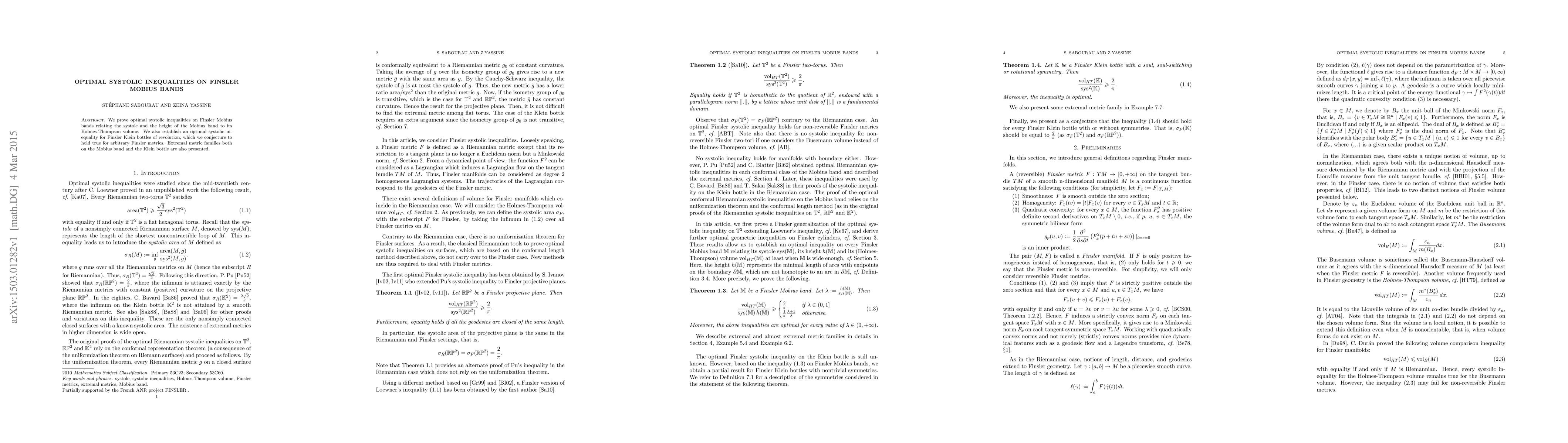 We prove optimal systolic inequalities on Finsler Mobius bands relating the systole and the height of the Mobius band to its Holmes-Thompson volume. We also establish an optimal systolic in- equality for Finsler Klein bottles of revolution, which we conjecture to hold true for arbitrary Finsler metrics. Extremal metric families both on the Mobius band and the Klein bottle are also presented.