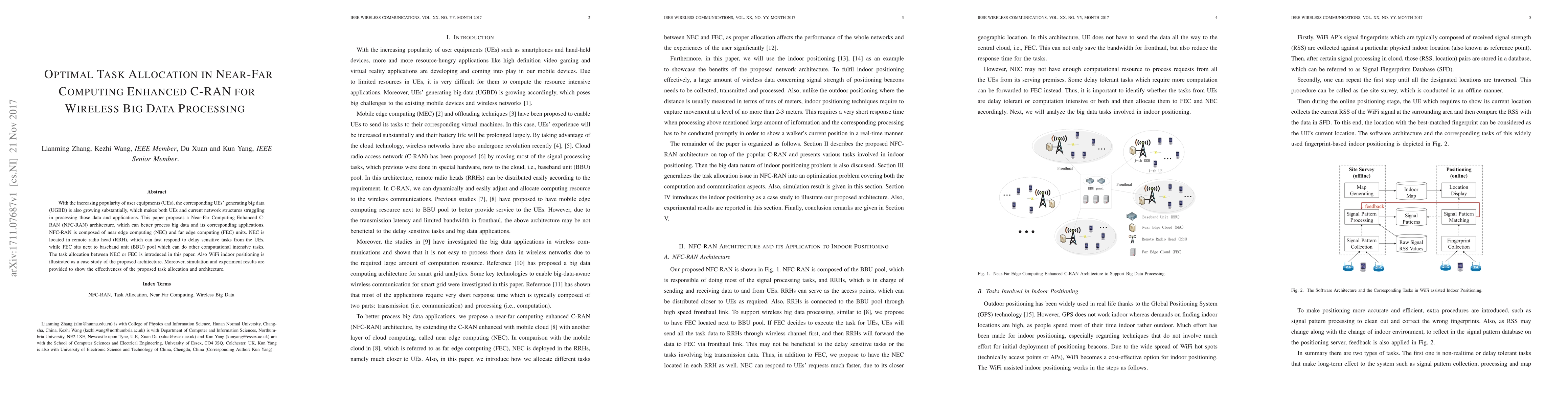 This paper proposes a Near-Far Computing Enhanced C-RAN (NFC-RAN) architecture to efficiently process growing user-generated big data. It introduces task allocation between near edge computing (NEC) and far edge computing (FEC) units, demonstrating improved performance through WiFi indoor positioning and supported by simulation results.
