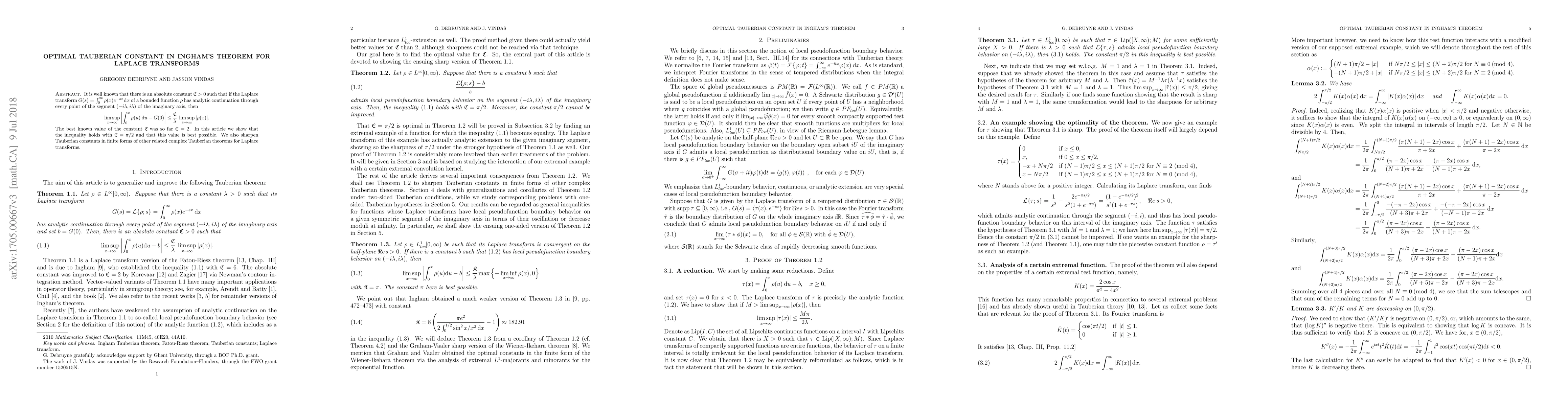 This paper demonstrates that the optimal Tauberian constant in Ingham's theorem for Laplace transforms is $\mathfrak{C}=\pi/2$, improving the previously known best value of $\mathfrak{C}=2$. The authors also refine Tauberian constants in related complex Tauberian theorems for Laplace transforms.
