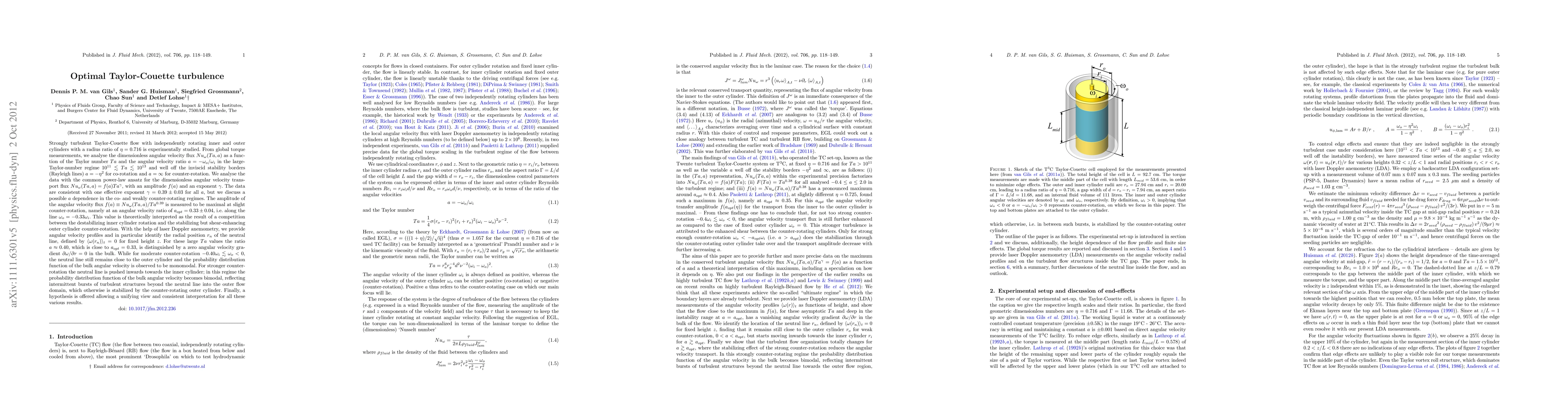 Strongly turbulent Taylor-Couette flow with independently rotating inner and outer cylinders with a radius ratio of \eta = 0.716 is experimentally studied. From global torque measurements, we analyse the dimensionless angular velocity flux Nu_\omega(Ta, a) as a function of the Taylor number Ta and the angular velocity ratio a = -\omega_o/\omega_i in the large-Taylor-number regime 10^{11} \lesssim Ta \lesssim 10^{13}. We analyse the data with the common power-law ansatz for the dimensionless angular velocity transport flux Nu_\omega(Ta, a) = f(a)Ta^\gamma, with an amplitude f(a) and an exponent \gamma. The data are consistent with one effective exponent \gamma = 0.39\pm0.03 for all a. The amplitude of the angular velocity flux f(a) = Nu_\omega(Ta, a)/Ta^0.39 is measured to be maximal at slight counter-rotation, namely at an angular velocity ratio of a_opt = 0.33\pm0.04. This value is theoretically interpreted as the result of a competition between the destabilizing inner cylinder rotation and the stabilizing but shear-enhancing outer cylinder counter-rotation. With the help of laser Doppler anemometry, we provide angular velocity profiles and identify the radial position r_n of the neutral line. While for moderate counter-rotation -0.40 \omega_i \lesssim \omega_o < 0, the neutral line still remains close to the outer cylinder and the probability distribution function (p.d.f.) of the bulk angular velocity is observed to be monomodal. For stronger counter-rotation the neutral line is pushed inwards towards the inner cylinder; in this regime the p.d.f. of the bulk angular velocity becomes bimodal, reflecting intermittent bursts of turbulent structures beyond the neutral line into the outer flow domain, which otherwise is stabilized by the counter-rotating outer cylinder. Finally, a hypothesis is offered allowing a unifying view for all these various results.
