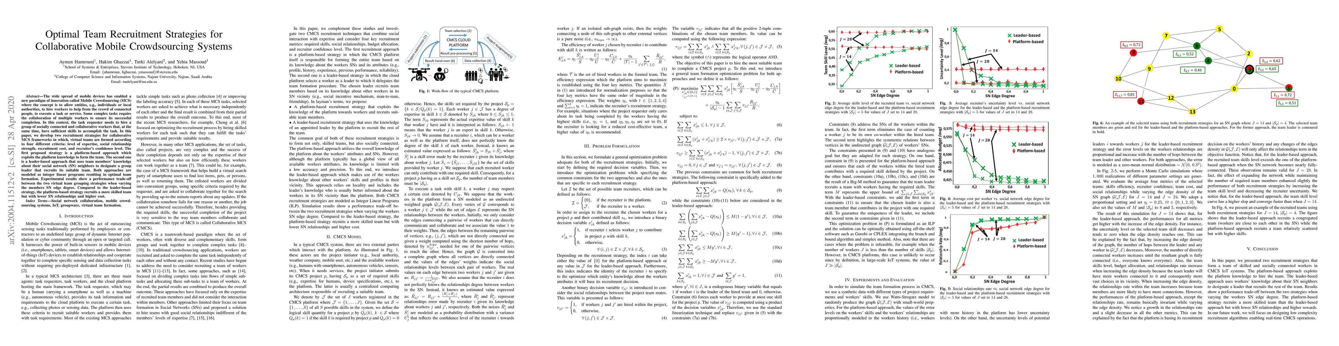 This paper proposes two optimal team recruitment strategies for mobile crowdsourcing systems: a platform-based approach leveraging platform knowledge and a leader-based approach using team members' social network knowledge. Experimental results show that while the platform-based strategy forms more skilled teams, it incurs higher costs and weaker social ties compared to the leader-based strategy.