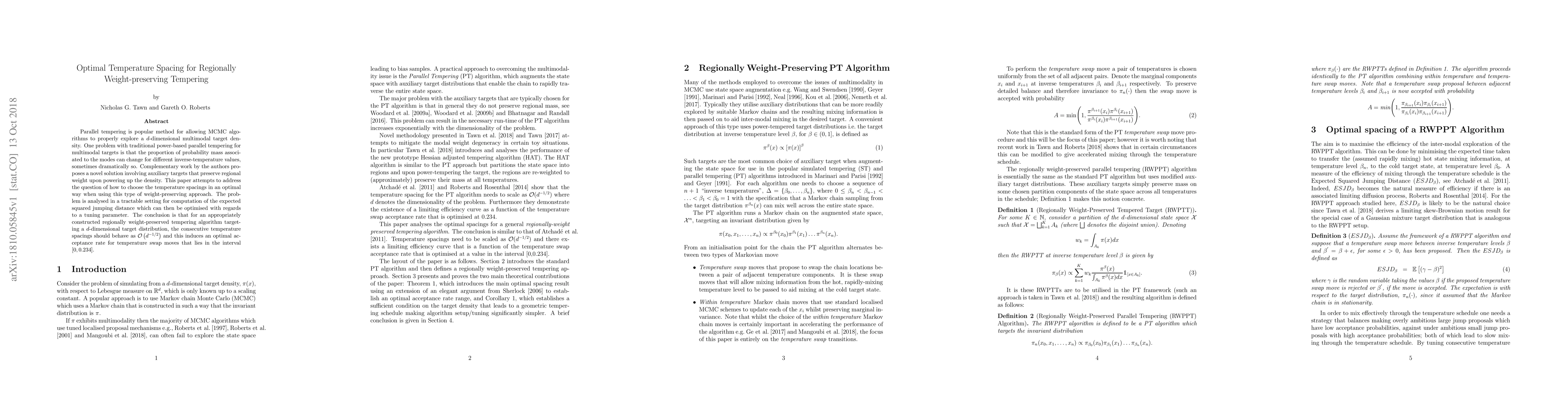 This paper investigates optimal temperature spacing for a weight-preserving parallel tempering method in MCMC algorithms, finding that spacings should scale as $\mathcal{O}\left(d^{-1/2}\right)$ for $d$-dimensional targets, leading to an optimal acceptance rate for swaps between $0$ and $0.234$.
