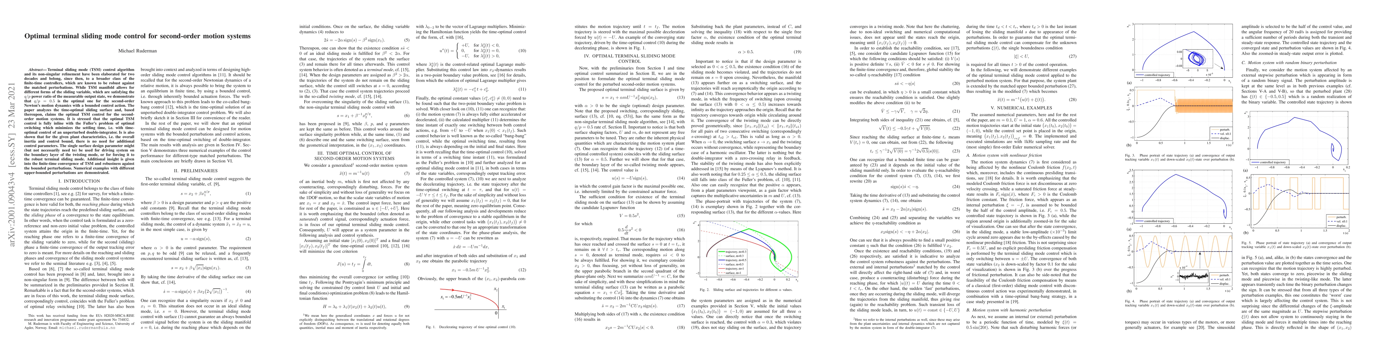This paper proposes an optimal terminal sliding-mode control for second-order motion systems, demonstrating that a $q/p$ ratio of 0.5 is optimal for minimizing settling time. It shows that the control method is robust against perturbations and requires no additional parameters beyond a single surface design parameter.