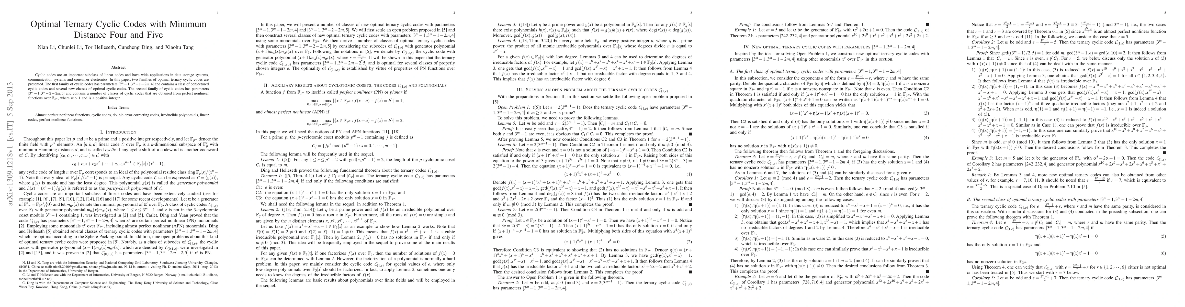 Two families of optimal ternary cyclic codes with minimum distance four and five are presented for applications in data storage and communication systems.